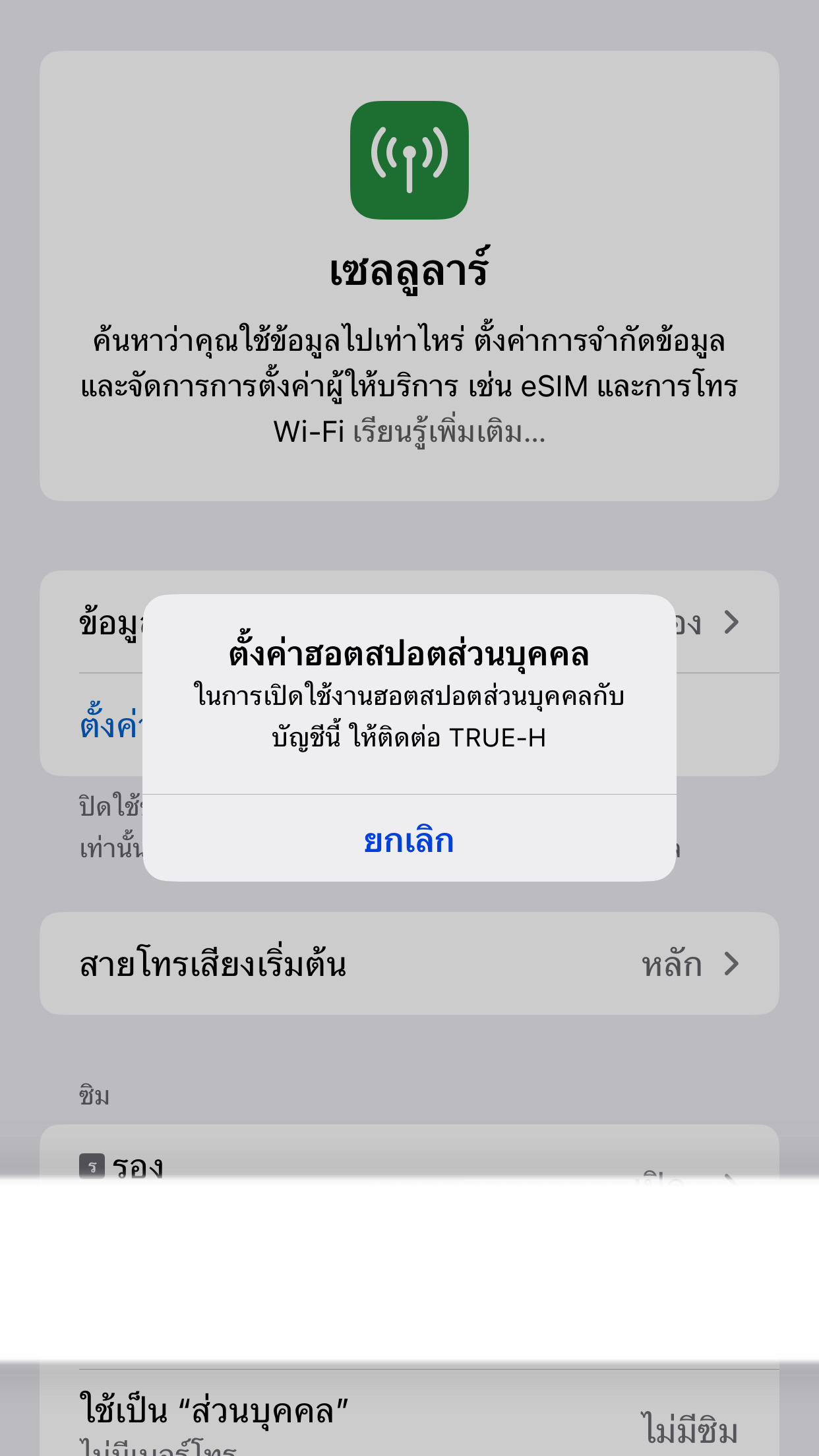 จะเข้าไปตั้งค่า ฮอตสปอตส่วนบุคคล แต่ข้อความแจ้งว่า ในการใช้งาฮอตตสปอตส่วนบุคคลกับบัญชีนี้ ให้ติดต่อ true-H ทำยังไงดีครับ