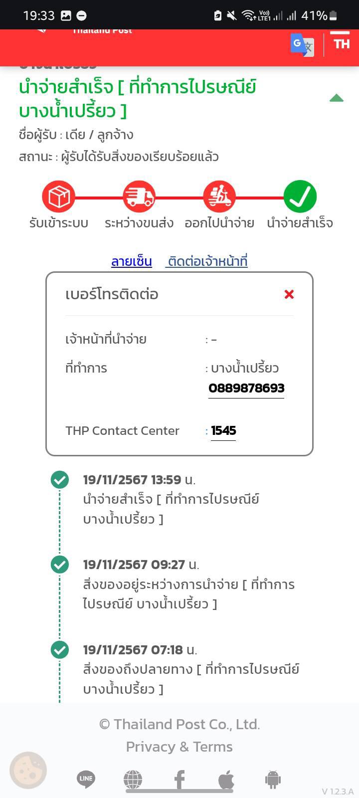 ไปรษณีย์ไทย EMS ขึ้นว่านำจ่ายสำเร็จ [ ที่ทำการไปรษณีย์ นนทบุรี ] แต่ไม่มีของมาส่ง