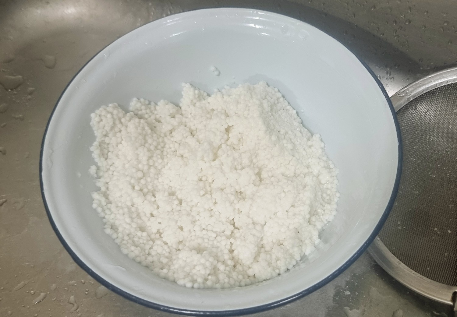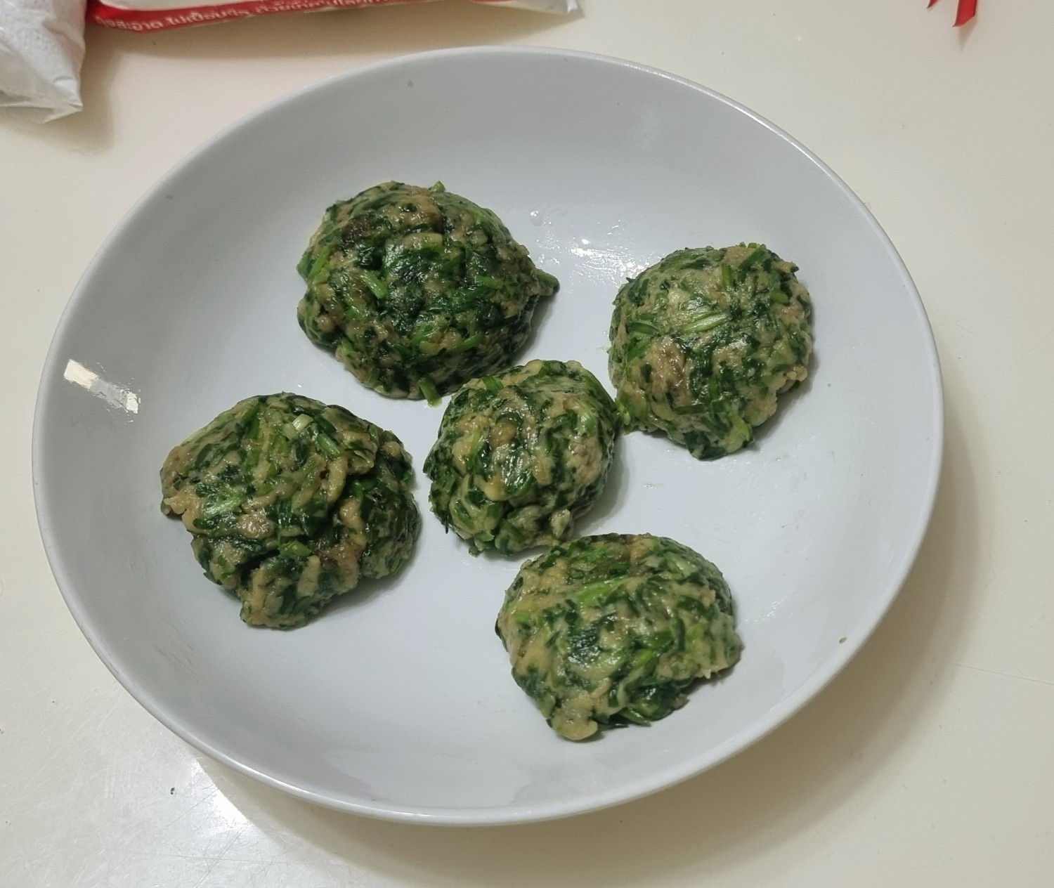 ผมใช้แป้งสาคูเล็ก มาแช่น้ำสักพัก กรองน้ำออก เอามานวดห่อผักกุยฉ่าย