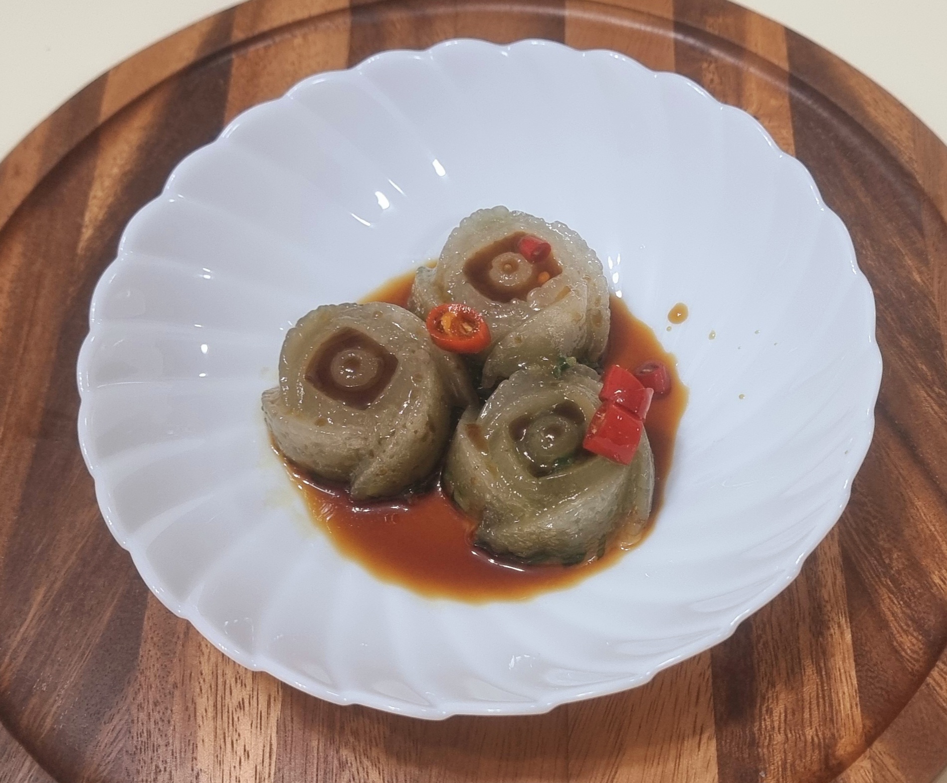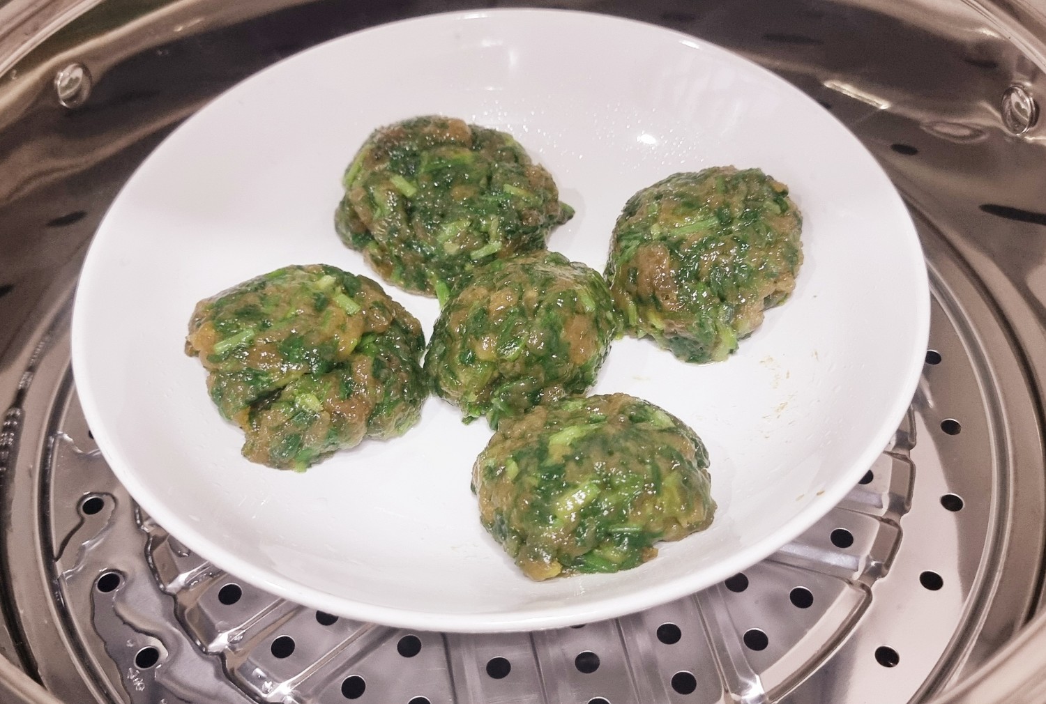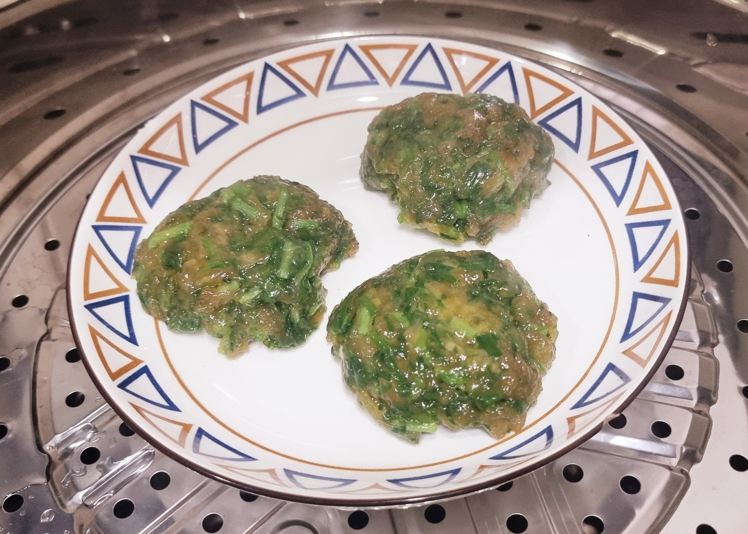 หั่นผัก ใส่ซีอิ๊วขาว ดอกเกลือ น้ำมันพืช น้ำเปล่า ผสมให้เข้ากัน นึ่งให้สุกสัก 70%