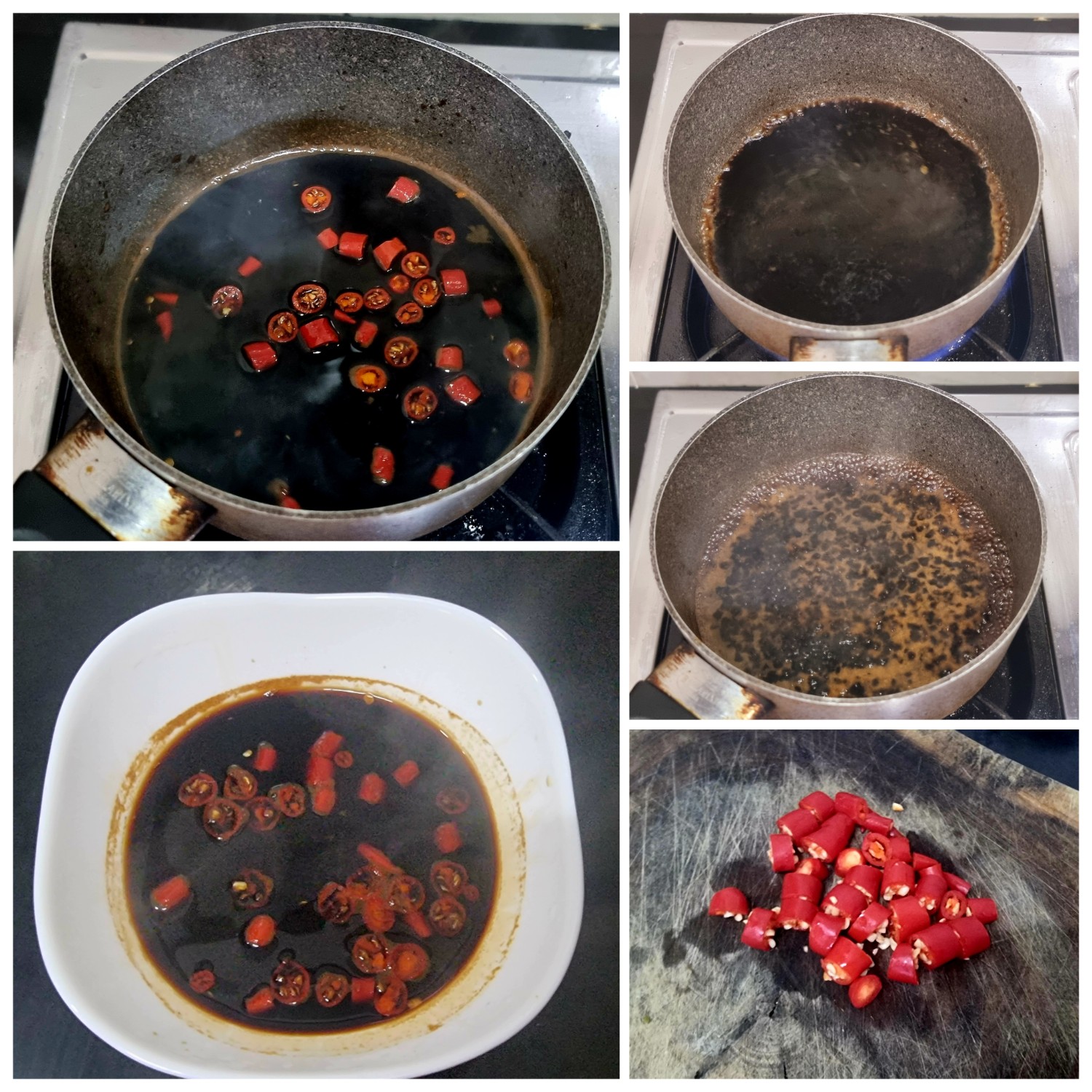เคี่ยวให้ละลายเข้าด้วยกัน ซอยพริกจินดา ใส่ลงไป แล้วปิดไป
