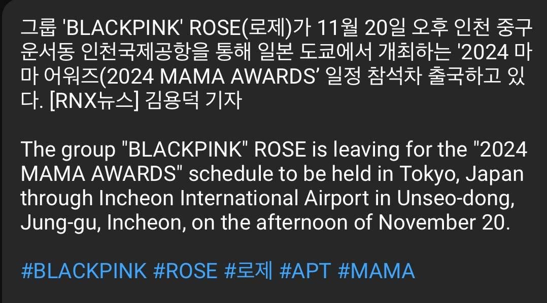 พรุ่งนี้ ROSÉ มีไฟล์ทบินไปญี่ปุ่น ตามรายละเอียดที่สำนักข่าวลงคือเข้าร่วมงาน MAMA 2024 👀