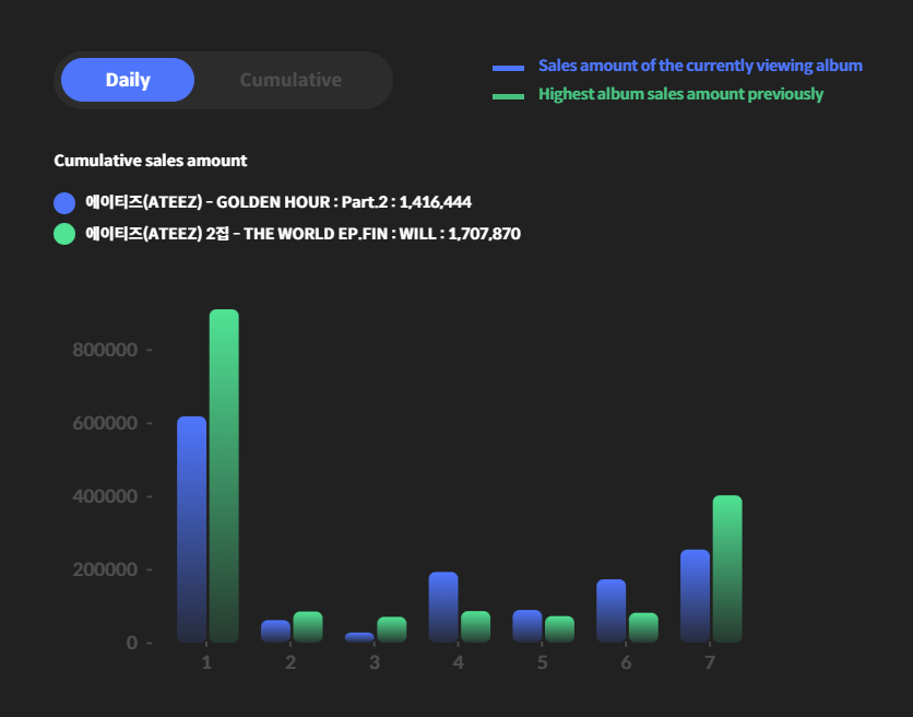 กลายเป็นอัลบั้มลำดับที่ 4 จาก ATEEZ (เอทีซ) ที่สามารถทำยอดขายมากถึง 1 ล้านก็อปปี้ในสัปดาห์แรกจากเว็บไซต์นี้ได้สำเร็จค่ะ