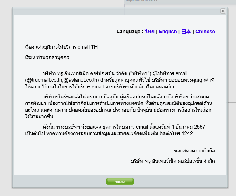 แจ้งข่าวคนที่เคยใช้ e-mail @truemail.co.th / @asianet.co.th ทางทรูจะยุติการให้บริการวันที่ 1 ธันวาคม 67 นี้แล้วนะครับ