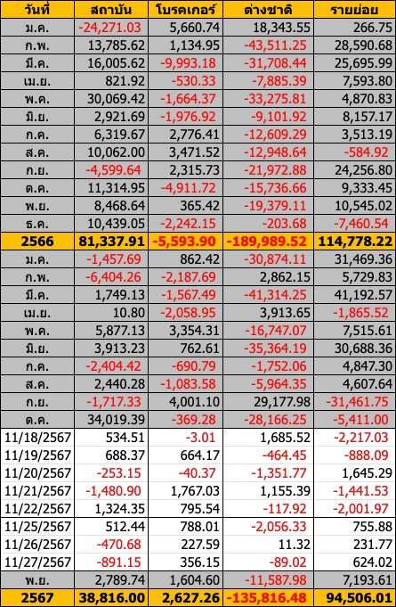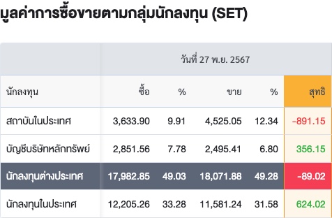 Sinthorn Summary 27/11/2567 : ต่างชาติขายสุทธิ -89.02 ลบ.