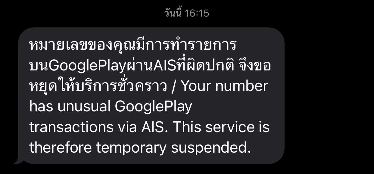 เราใช้เบอร์รายเดือน AIS ในรอบบิลปัจจุบันและ 2 รอบบิลย้อนหลัง อยู่ๆได้รับ SMS โดนคิดค่าบริการจาก google 1.google one 2.whocall premium ทั้งที่เราไม่ได้สมัคร และไม่ได้กดซื้อ เราตรวจสอบในบัญชี g-mail ทั
