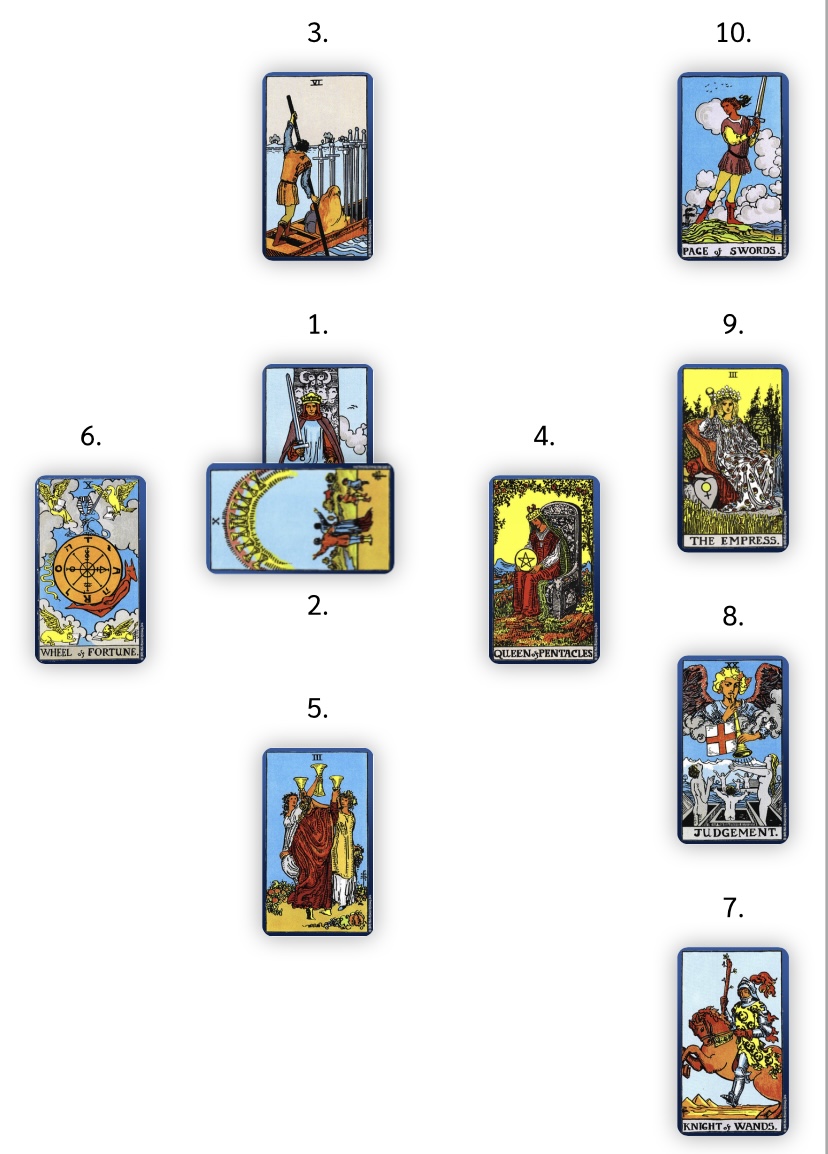 1.THE TWO OF CUPS2.ACE OF SWORDS3.THE TWO OF WANDS4.ACE OF CUPS5.THE THREE OF SWORDS6.The Emperor7.THE SEVEN OF SWORDS8. THE FIVE OF WANDS9. The Chariot10.THE PAGE OF PENTACLES รบกวนแปลความห