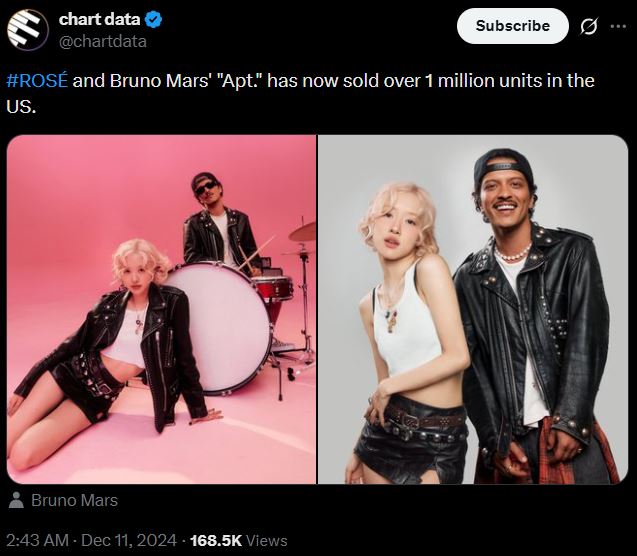 เพลง APT. ของ ROSÉ & Bruno Mars มียอดขายมากกว่า 1 ล้านยูนิต ในสหรัฐอเมริกา 🎉