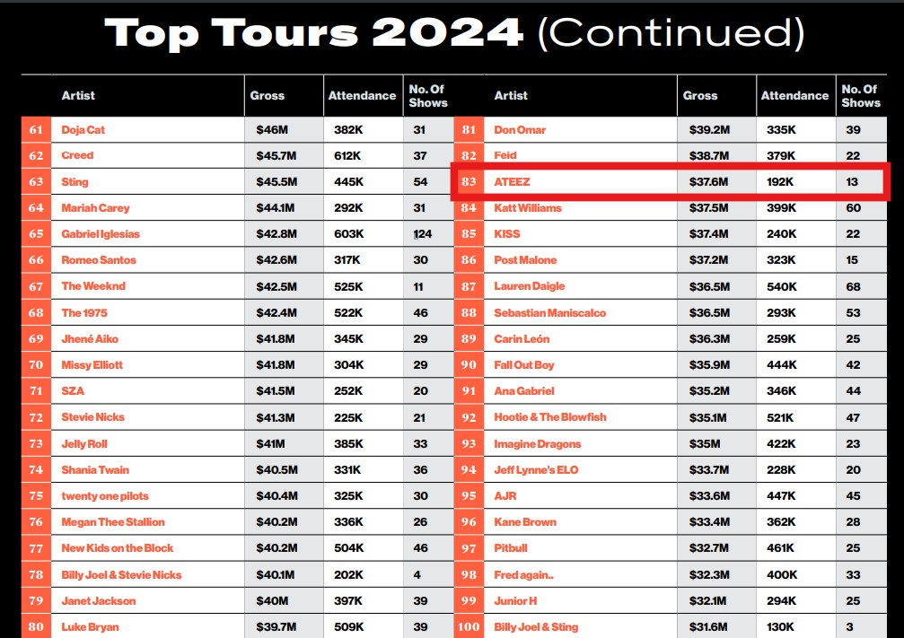 ATEEZ — ติดอันดับ 83 บน Billboard The Year in Touring 2024 ด้วยยอดขายบัตร 192K จากทัวร์ในทวีปอเมริกาเหนือ 13 รอบ 🎉