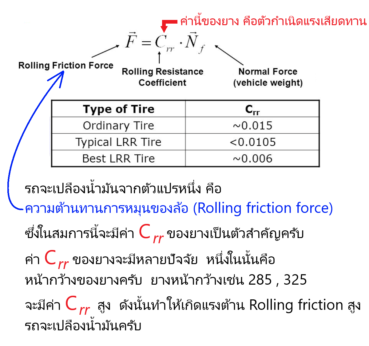 ประเด็นที่ผมถามคือแรงเสียดทานระหว่างล้อกับถนน ไม่ใช่แรงเสียดทานของเพลาของเกียร์ ที่จะต้านการเคลื่อนไหว แต่อันนี้มันเป็นแรงที่ทำให้ล้อยึดเกาะถนน ลองนึกว่าถ้าล้อมันลื่น แรงขับที่ส่งลงไปมันก็เสียเปล่า ซึ่งจะทำให้สิ้นเปลืองพลังงานมากขึ้น ผมเลยตั้งคำถามตามที่เคยได้ยินมาว่าจริงหรือไม่ที่ล้อหน้ากว้างจะทำให้สิ้นเปลืองมากขึ้น