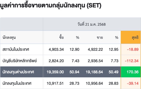 Sinthorn Summary 21/1/2568 : ต่างชาติซื้อสุทธิ 170.36 ลบ.
