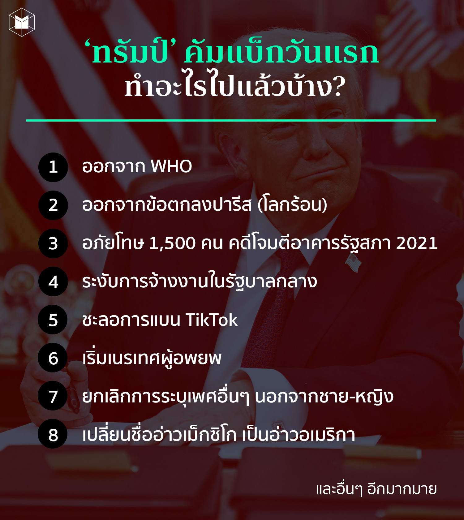 ทรัมป์ก็ไม่ปล่อยให้เวลาเสียไปแม้แต่วินาทีเดียว เพราะเพียงวันแรกของการทำงาน เขาได้ลงนามในเอกสารต่างๆ ไปแล้วเกือบร้อยฉบับ