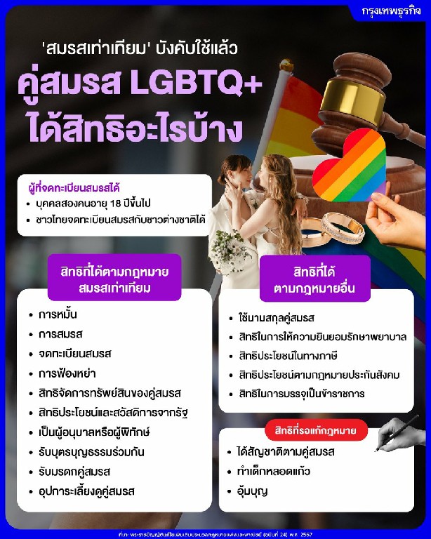 23 มกราคม 2568 ประเทศไทย สร้างประวัติศาสตร์บังคับใช้กฏหมาย “สมรสเท่าเทียม” ซึ่งจะทำให้คู่รัก “LGBTQ+” หรือกลุ่มผู้มีความหลากหลายทางเพศ สามารถจดทะเบียนสมรสกันได้อย่างถูกกฎหมาย ทำให้ประเทศไทยเป็นประเทศแรกในเอเชียตะวันออกเฉียงใต้ที่ประกาศใช้กฎหมายนี้