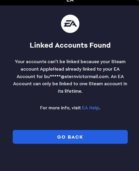 เชื่อม EA account กับ steam ไม่ได้เพราะว่ามีเมล์เชื่อมอยู่แล้ว