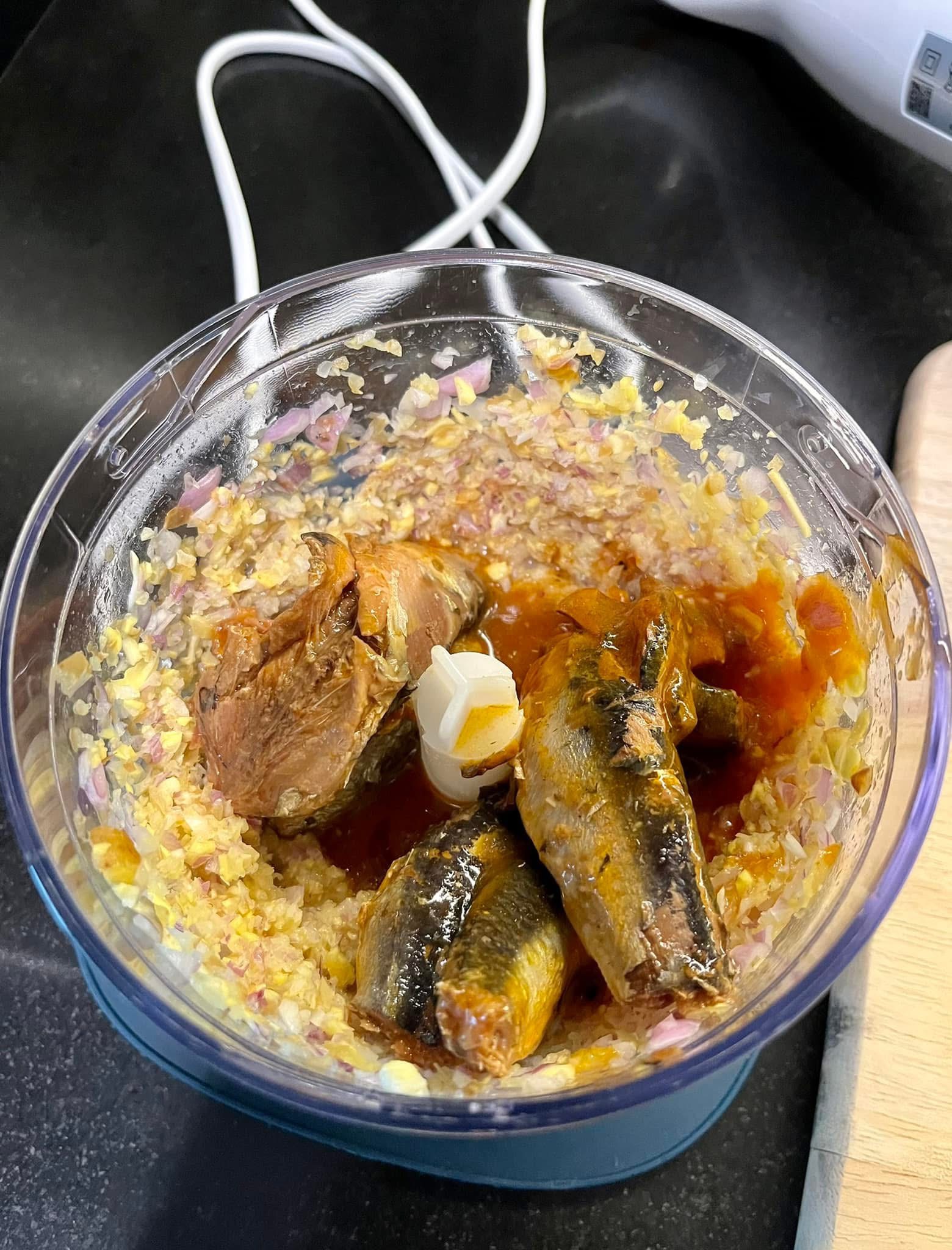 - นำกระชายและหอมแดงปั่นรวมกันก่อนแล้วตามด้วยปลากระป๋อง ปั่นส่วนผสมทั้งหมดอีกครั้งให้ละเอียด