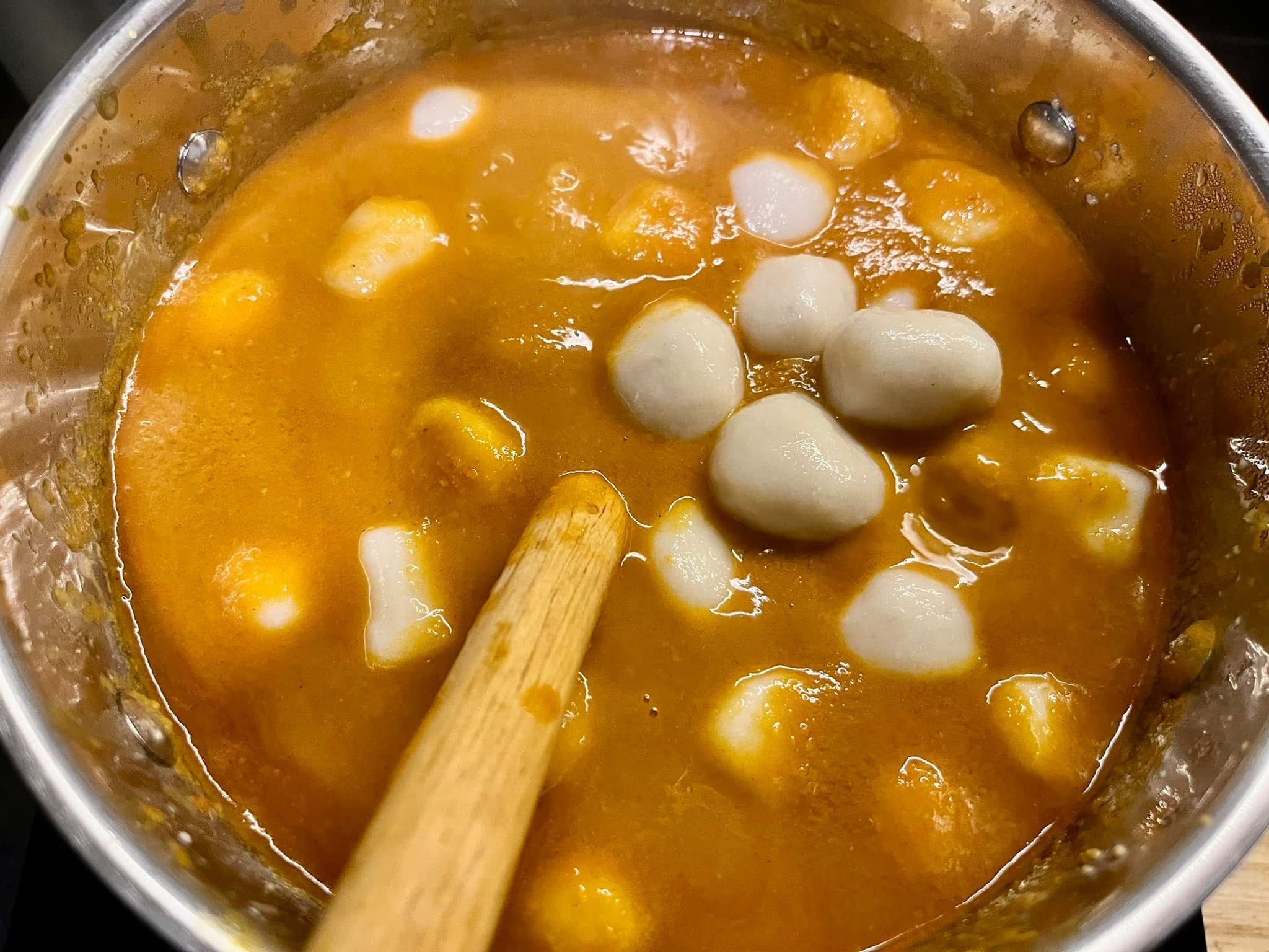 - นำลูกชิ้นปลาลงไป ตามด้วยต้นหอม ต้มรอต้นหอมสุก