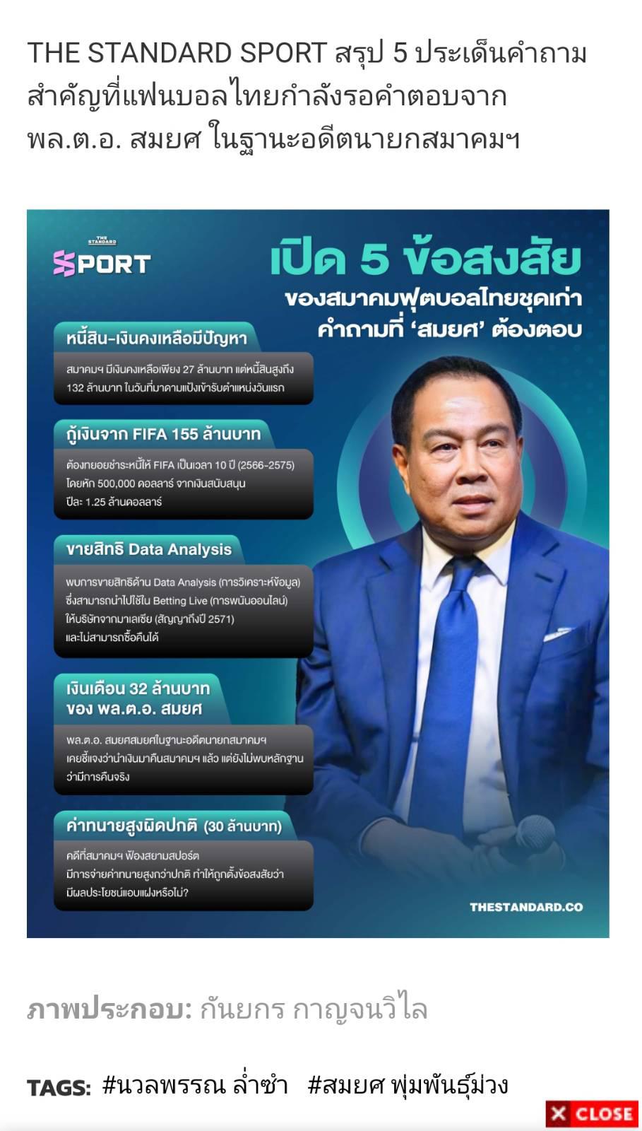 วันนี้เที่ยง พล.ต.อ. สมยศ พุ่มพันธุ์ม่วง นายกสมาคมกีฬาฟุตบอลแห่งประเทศไทยฯ ได้เข้าร่วมการประชุมสมัชชาใหญ่สามัญ คณะกรรมการโอลิมปิกแห่งประเทศไทย ในพระบรมราชูปถัมภ์ ครั้งที่ 1/2560 และได้บอกว่าในสัญญาข้อ