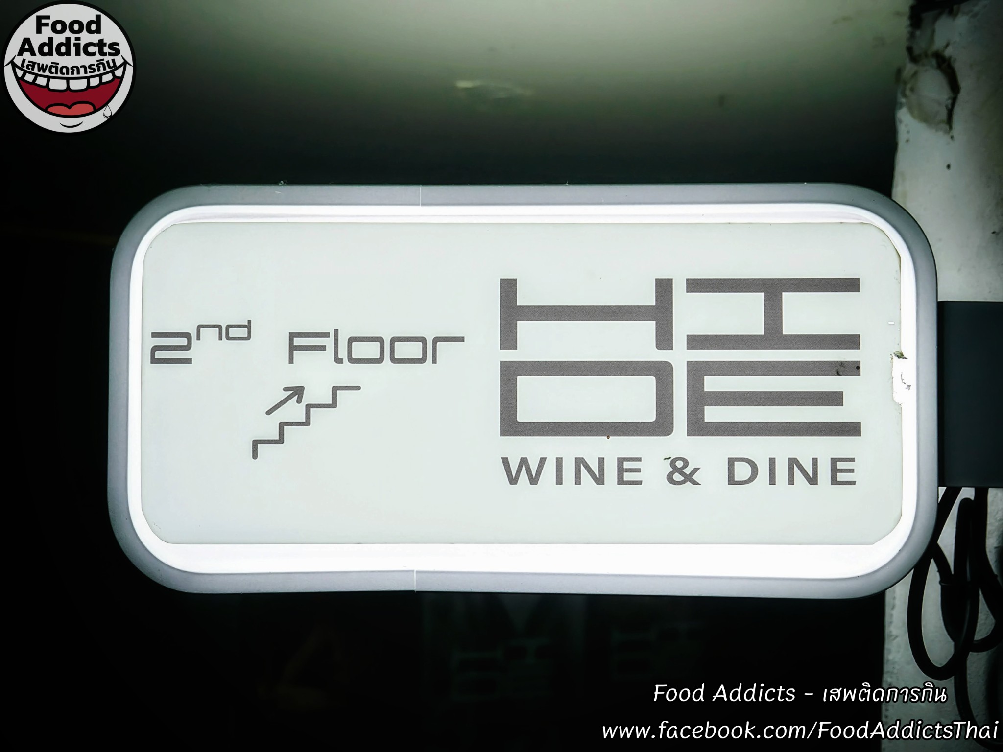 บรรยากาศภายในร้าน "Hide Dine & Wine" ใกล้ๆ BTS สถานีสะพานควายแห่งนี้เน้นการตกแต่งสไตล์ผสมผสานเริ่มต้นจากเลือกใช้พื้นลายไม้สีเบจส่วนเหล่าเฟอร์นิเจอร์พวกโต๊ะเก้าอี้หลากหลายดีไซน์ทั้งทันสมัยสลับวินเทจย้อนยุคไม่รู้สึกเบื่อบุเบาะนุ่มชวนนั่งสบายประดับโคมไฟแขวนผนังวางพื้นกระจายทุกมุมแสงเหลืองมืดสลัวหน่อยให้ความรู้สึกอบอุ่นสมเป็นภัตตาคาร Casual Dining ผนังกระเบื้องเอิร์ทโทนซุ้มด้านหน้าประตูทางเข้าเขียนตัวอักษรภาษาญี่ปุ่นพร้อมเคาน์เตอร์บาร์สำหรับจัดเตรียมเครื่องดื่มโดดเด่นบริเวณใจกลางวางขวดไวน์เปล่าใส่ดอกกุหลาบสีแดงเรียงเยอะแทบทุกแห่งมองเข้าไปตรงห้องครัวจัดเตรียมอาหารก็สะดุดตากับป้ายไฟนีออนซึ่งเขียนว่า "I'm Not Drunk, I'm Just Chemically Off Balance" แปลฉบับกวนหน่อยนั่นก็คือ "ฉันไม่ได้เมาแค่ไม่สมดุลทางเคมี" หน้าต่างกระจกใสบานขนาดใหญ่เห็นระบบจราจรบนถนนพญาไทวิ่งผ่านตอนกลางคืนสวยงามสุดโรแมนติก รับรองลูกค้าได้ตั้งแต่ 2 คนขึ้นไปมีห้องส่วนตัวซ่อนอยู่หลังม่านกำมะหยี่แดงสำหรับ 8-16 ท่านสามารถจัดปาร์ตี้ในโอกาสพิเศษหรือจำนวนสมาชิกกลุ่มใหญ่กว่านั้นจัดเตรียมได้มากถึง 30 ท่านและเวทีแสดงดนตรีสดจากเหล่าศิลปิน The Voice Thailand สลับกันเรื่อยๆวันพฤหัสบดี-เสาร์เท่านั้นเวลา 20:00-22:00 น.ห้ามพลาดเด็ดขาดเลยครับผม