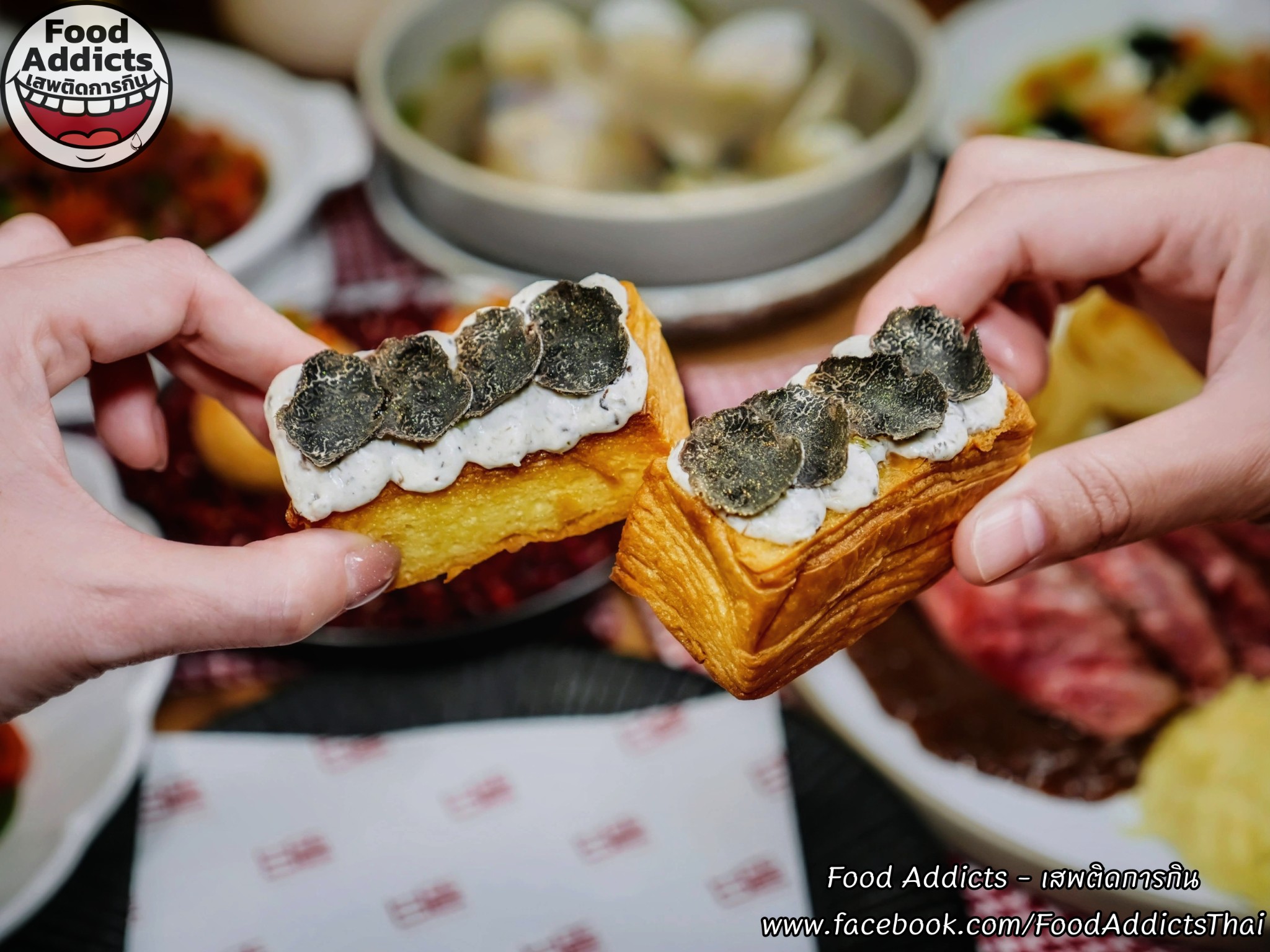 ตอนแรกวางแผนจะจองแบบคอร์สราคาคู่ละ 1,990 บาท++ แต่จำนวนจำกัดต่อวันปัจจุบันคิวยาวมากไม่อยากรอนานเลยต้องเลือกเป็น A La Carte ปกติธรรมดา เริ่มต้นกันด้วยเมนูเรียกน้ำย่อยแสนเรียบง่ายแต่อร่อยเกินคาดนั่นก็คือ "Berries & Wild Rocket" ราคา 360 บาท ผักสลัดร็อกเกตส่งตรงจากฟาร์มเกรดออร์แกนิกกลิ่นหอมเฉพาะตัวโดดเด่นไม่เหมือนใครคลุกเคล้าซอสเบอร์รี่บัลซามิกตำรับลับเปรี้ยวอมหวานกลมกล่อมท็อปปิ้งเหล่าผลไม้สดหลากหลายชนิดวางเรียงเต็มหน้าทั้งมะเขือเทศ,บลูเบอร์รี่,สตรอว์เบอร์รี่,เคพกูสเบอร์รี่,องุ่นไชน์มัสคัสสีสันสดใสสวยงามเพิ่มพาร์เมซานชีสไลซ์แผ่นบางตัดเค็มนัวละมุนกลมกล่อมเสิร์ฟแบบแช่เย็นสดชื่นเหมาะแก่การนั่งฟินในช่วงฤดูร้อนประเทศไทยอย่างยิ่ง / "Truffle Toast" ราคา 380 บาท ขนมปังพันชั้นหรือ Thousand Layer Bread ใช้แป้งโดว์ขนมปังทั่วไปแต่เสริมเสน่ห์วิธีจัดเตรียมคล้ายครัวซองต์เบเกอรี่ชื่อเสียงโด่งดังแห่งฝรั่งเศสสัมผัสยืดหยุ่นเหนียวนุ่มสู้ฟันหั่นแบ่งชิ้นขนาดกำลังพอดีคำอบอีกครั้งเมื่อลูกค้าออเดอร์จนรอผิวข้างนอกกรุบกรอบชุ่มฉ่ำเนยค่อยทามูสครีมทรัฟเฟิลฉบับโฮมเมดปิดท้ายเห็ดทรัฟเฟิลสีดำแหล่งธรรมชาติของแท้ 100% สัญชาติอิตาลีวัตถุดิบระดับพรีเมียมหารับประทานยากกลิ่นรุนแรงเด่นชัดผสมผสานได้ลงตัวรับรองว่าประทับตราตรึงใจทุกท่านแน่นอนครับผม