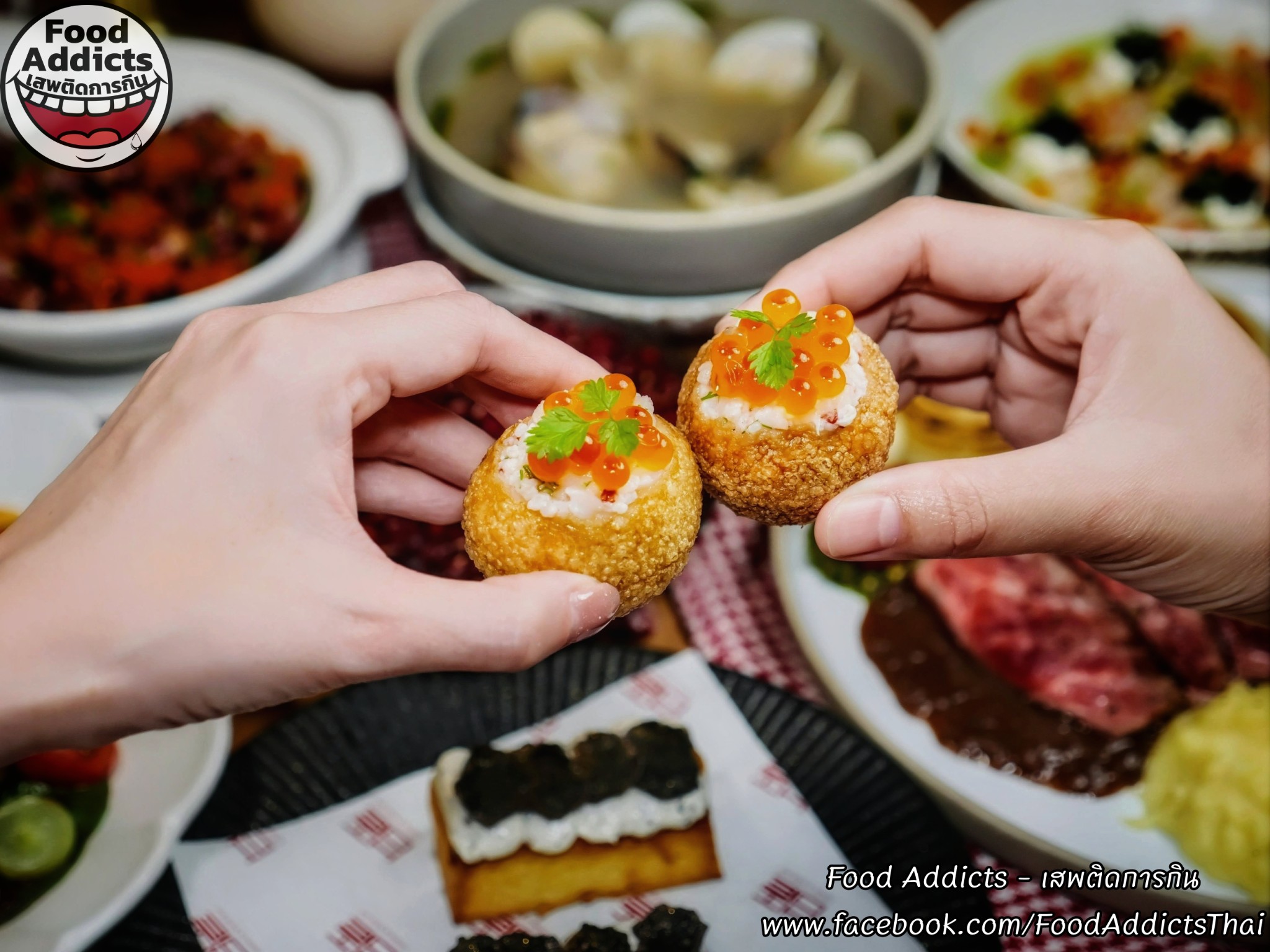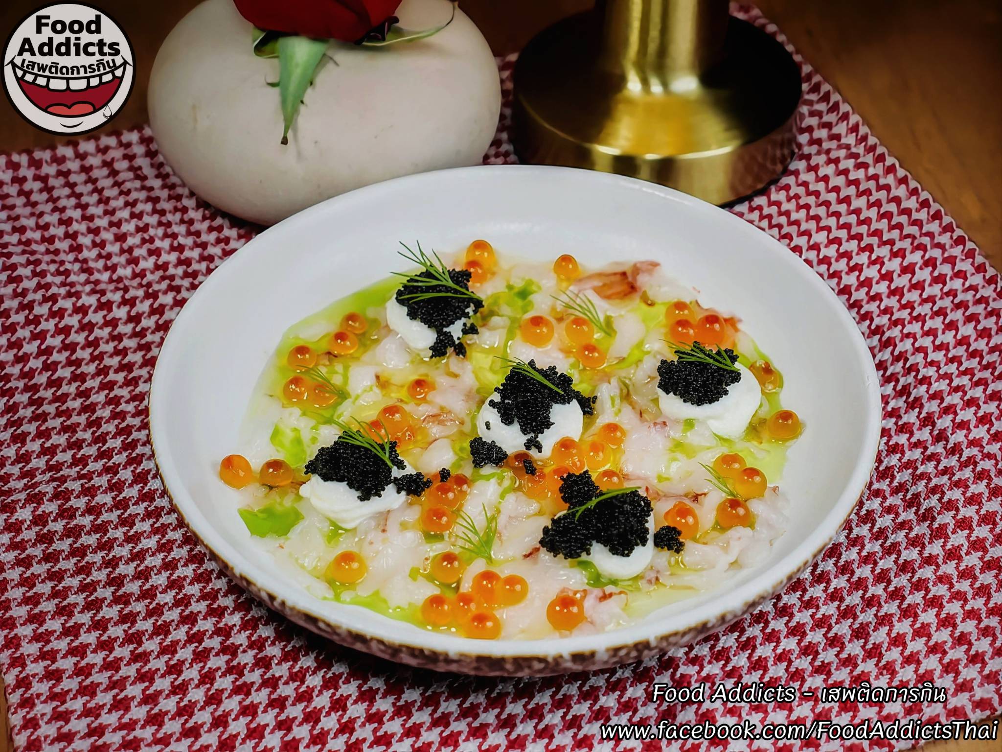 รายการถัดไปนั้นยังคงอยู่ภายในหมวดรายการเรียกน้ำย่อยนึกไม่ออกว่าจะสั่งอะไรดีแต่อยากได้เมนูที่อร่อยและถ่ายรูปสวยอวดเพื่อนลงโซเชียลสวยงามบอกน้องพนักงานช่วยแนะนำเป็น "Crunchy Ball" ราคา 180 บาท แป้งปานีปูรีชนิดแผ่นตากแห้งสำเร็จรูปสัญชาติอินเดียทอดผ่านน้ำมันร้อนอุณหภูมิสูงสักครู่ผิวสัมผัสเบาบางเบากรอบฟูรูปทรงกลมสมมาตรคล้ายลูกบอลสวยงามเจาะด้านบนเล็กน้อยเพื่อสอดไส้พวงไข่ปลาคอตดองเผ็ดหรือเมนไทโกะตีผสมครีมชีสนมวัวล้วน 100% เนื้อกุ้งทะเลธรรมชาติหวานฉ่ำปิดท้ายไข่แซลมอนดองซีอิ๊วโชยุสีส้มประดุจดั่งอัญมณีสะท้อนเล่นแสงสวยงามเมื่อถูกกัดพร้อมแตกระเบิดกระจายแน่นเต็มปากวางเสิร์ฟบนเมล็ดถั่วแดงญี่ปุ่นสายพันธุ์อาซูกิ / "Scallet Prawn Cappacio" ราคา 360 บาท กุ้งแดงนำเข้าจากประเทศอาร์เจนตินาเกรดซาชิมิเชฟบรรจงเด็ดหัวแกะเปลือกถึงปลายทิ้งหางคัดเฉพาะเนื้อตัดแต่งเรียงบนภาชนะบีบมูสครีมเปลือกส้มยูซุกระจายเต็มจานปรุงน้ำส้มสายชูเหล้ามิริน,สาเกผ่านไฟระเหยแอลกอฮอล์หมดเกลี้ยงเหลือแต่รสหวานอมเปรี้ยวล้ำลึกอูมามิราดน้ำมันใบโหระพาสกัดตกแต่งยอดผักชีลาว,อิคุระกับไข่ปลาบินสีดำสนิทลักษณะคล้ายคาเวียร์เหมือนกำลังมองผลงานศิลปะชิ้นหนึ่ง วิธีฟินตักส่วนประกอบทุกๆอย่างพร้อมกันซับซ้อนเย็นสดชื่นละมุนละไมดีเกินคาดหมายต้องมาลองเองครับ