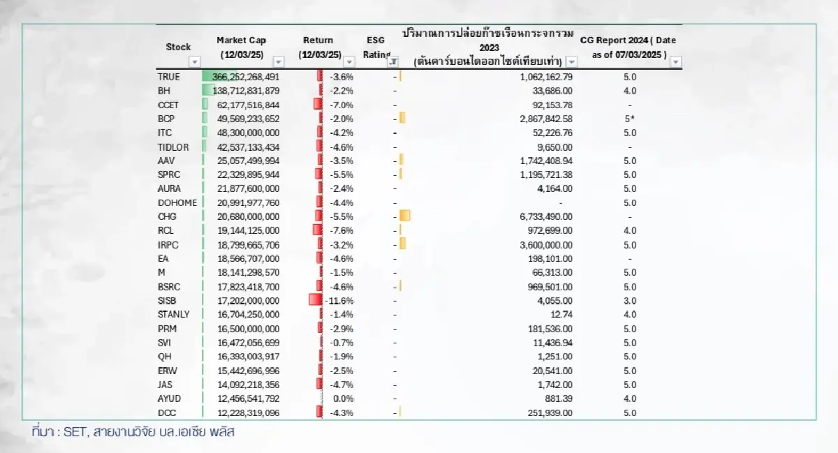 ฝ่ายวิจัย บล.เอเซีย พลัส ได้กรองเพิ่มเติมว่ามีหุ้นอีกหลายบริษัทที่ไม่มี ESG Rating แต่มีการเปิดเผยข้อมูลก๊าซเรือนกระจก และ/หรือ มีการสำรวจการกำกับดูแลกิจการบริษัทจดทะเบียน (CGR) พบว่า มีจำนวน 25 บริษัท ที่เป็นหุ้นขนาดกลางใหญ่ และราคาหุ้นปรับตัวลดลงตั้งแต่ต้นปี (YTD) ประกอบด้วย
