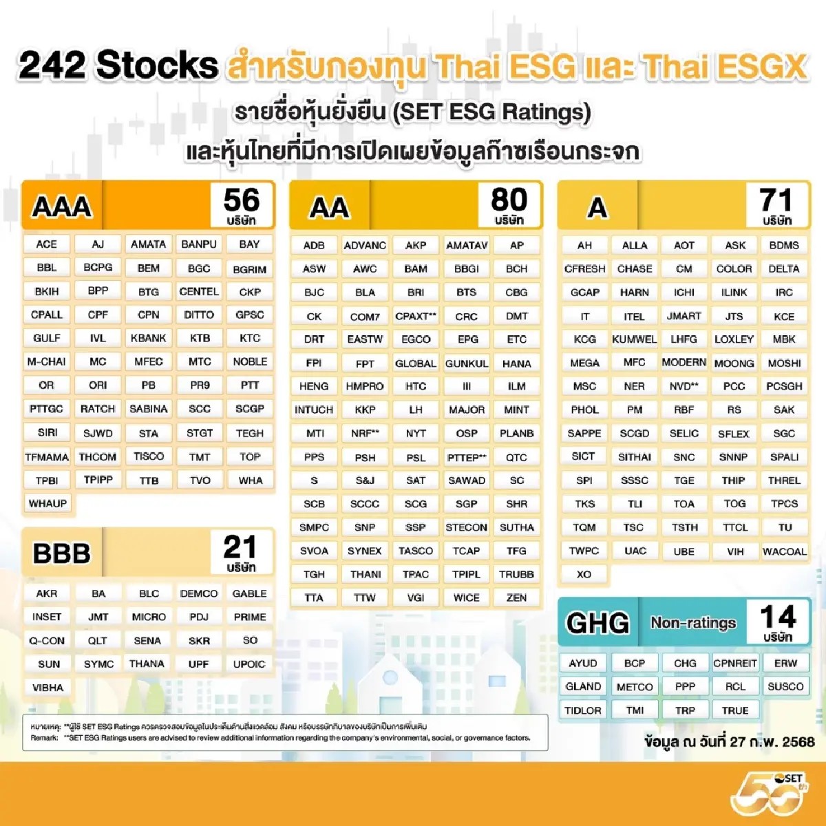 สำหรับรายชื่อหุ้นยั่งยืน (SET ESG Rating) และหุ้นไทยที่มีการเปิดเผยข้อมูลก๊าซเรือนกระจกสำหรับกองทุน Thai ESG และ Thai ESGX โดยมีจำนวนหุ้น 14 บริษัท ที่เป็น Non-rating ประกอบด้วย AYUD, BCP, CHG, CONREIT, ERW, GLAND, METCO, PPP, RCL, SUSCO, TIDLOR, TMI, TRP, TRUE
