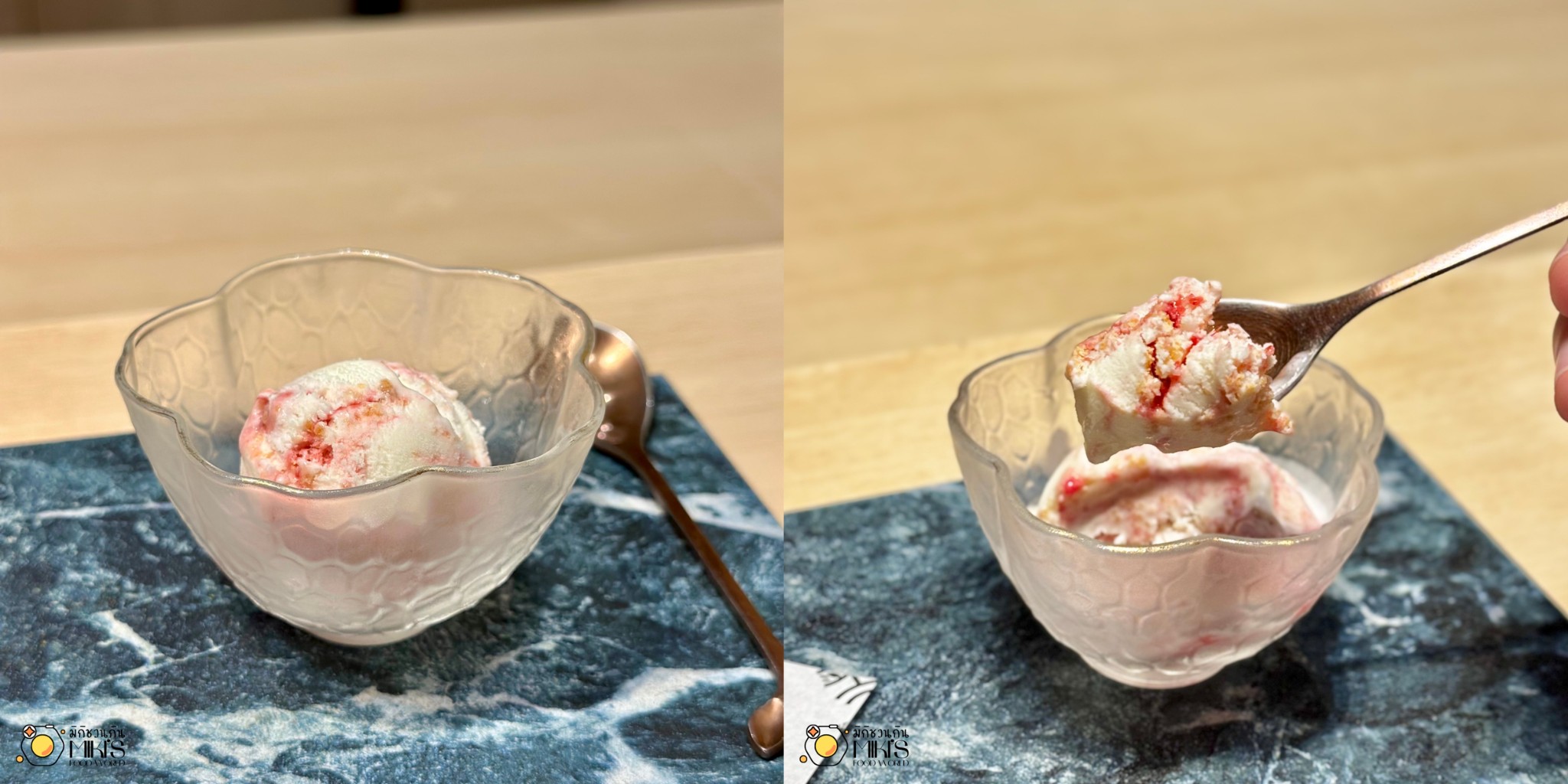 Ice-cream ไอติมสตอเบอร์รี่ชีสเค้ก รสเปรี้ยวอมหวานที่มีความครีมมันของชีสผสมอยู่ด้วย ปิดจบคอร์สได้สวยงาม