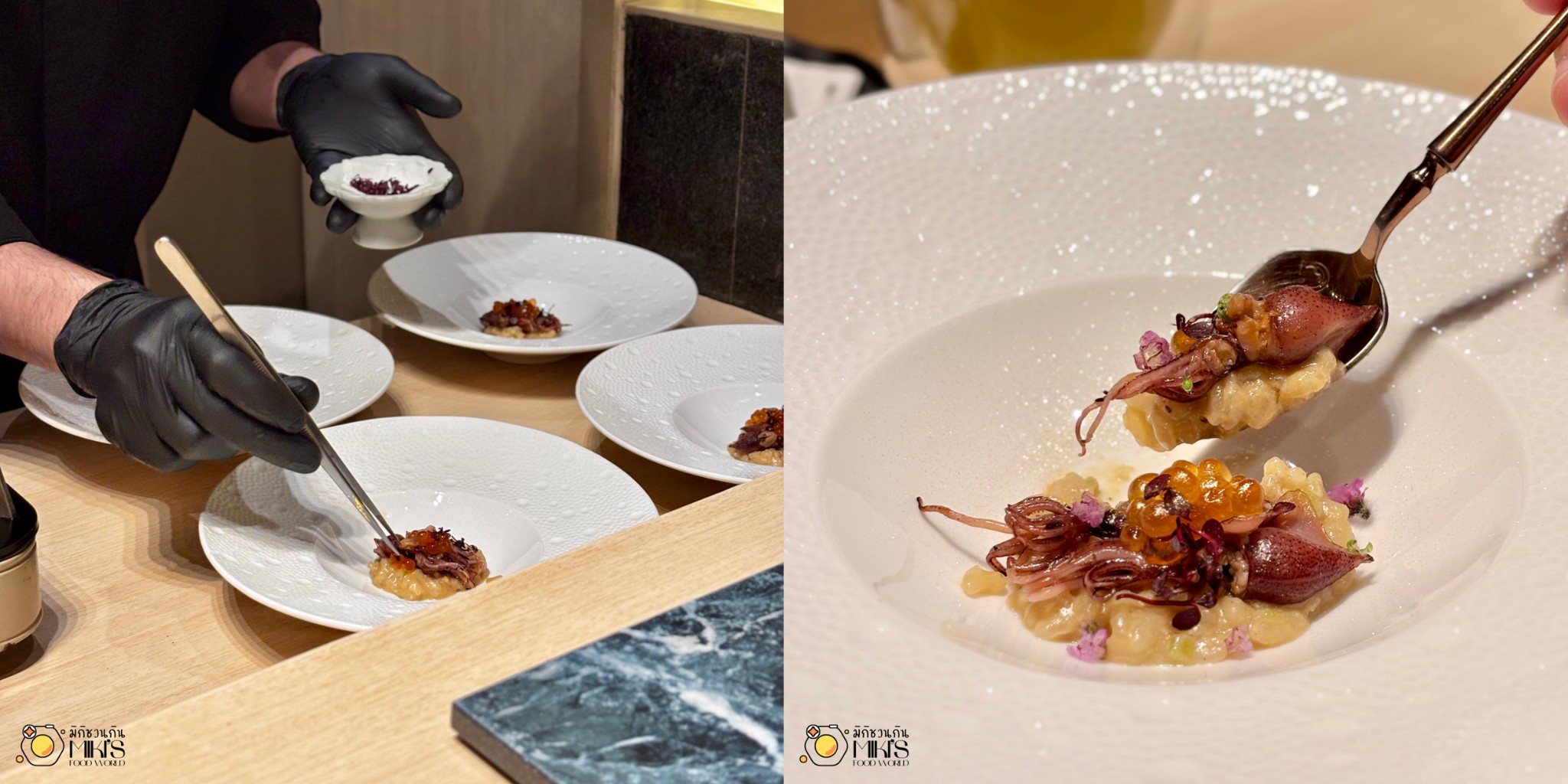 Hotaru Ika Risotto หมึกหิ่งห้อย วัตถุดิบของฤดูนี้ ที่มีสัมผัสนุ่มหนึบ วางบนรีซอสโตที่เคี้ยวและตุ๋นมาจนได้เนื้อหนึบกำลังดี มีความหอมละมุน กลิ่นเนยฟุ้งกระแทกใจมาก