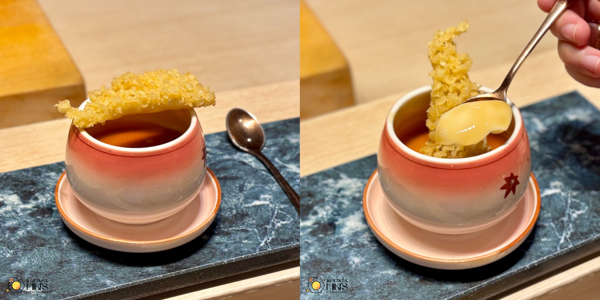 Chawanmushi ไข่ตุ๋นเนื้อเด้ง ที่เสิร์ฟพร้อมเทมปุระปลาทราย และราดด้วยซอสเทมปุระรสหวานนวล เวลาทานให้นำปลาเทมปุระดิปลงในไข่ตุ๋นได้เลย