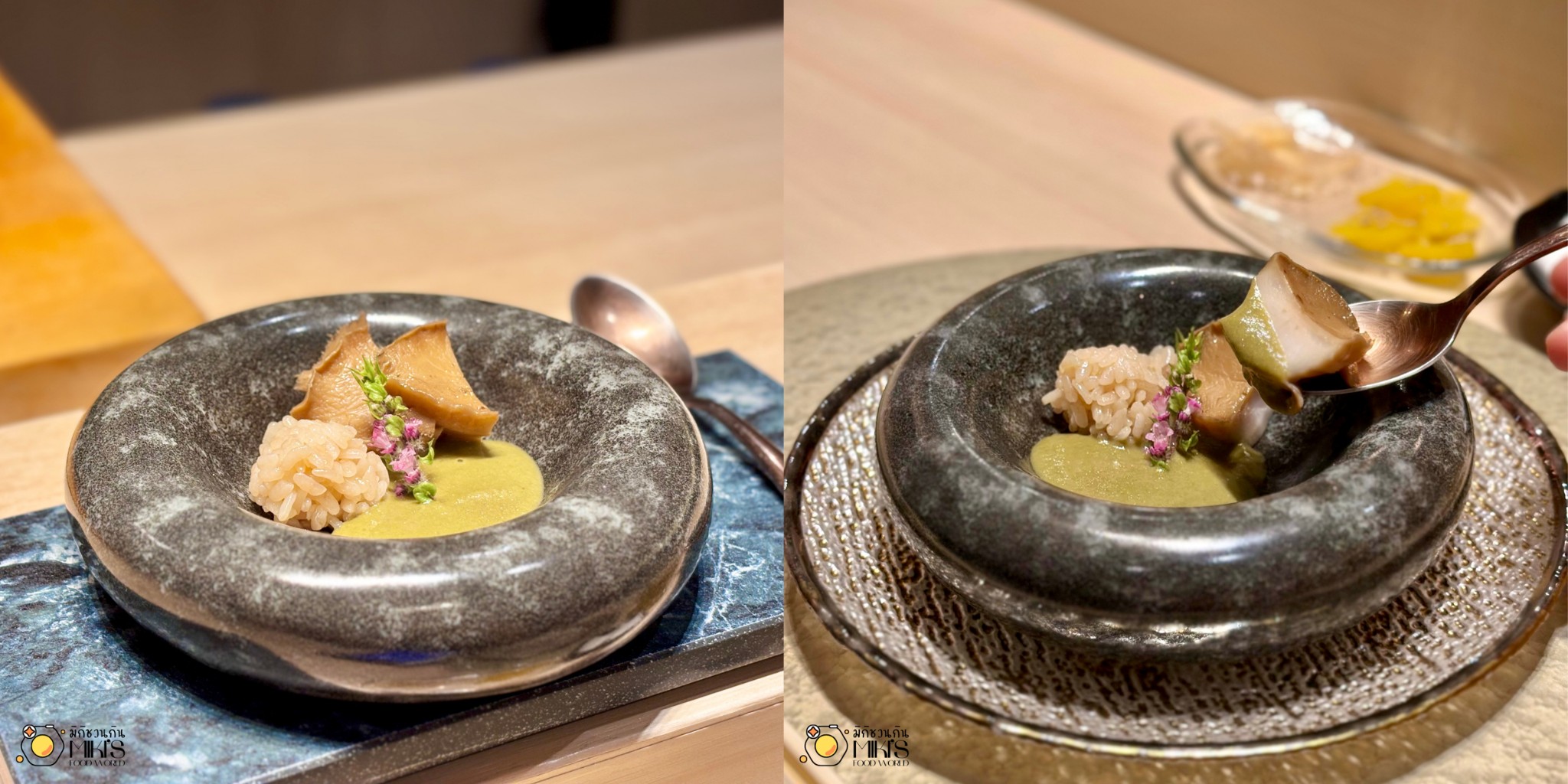 Awabi หอยเป๋าฮื้อที่นำไปต้มจนได้ความนุ่ม ไม่เหนียว ราดด้วยซอสที่ทำมาจากตับหอย ให้รสครีมมัน หวานหอม ทานด้วยกันแล้วจะได้ความละมุนทุกคำ