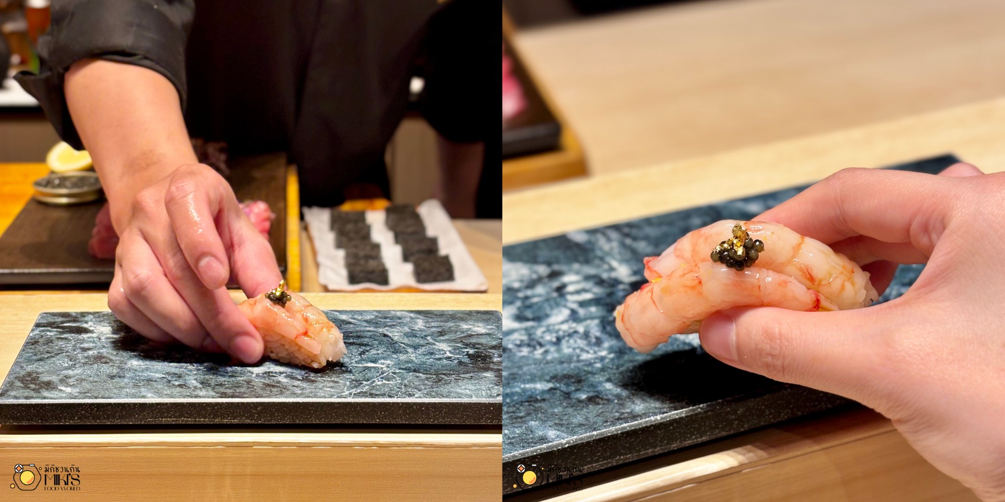 Ama Ebi & Caviar กุ้งหวานเนื้อกรอบเด้ง มีความสดมากจนรับรสหวานของเนื้อกุ้งได้ เติมความสดชื่นด้วยยุซุซอสรสเปรี้ยวเล็กๆ ยิ่งเข้ากันได้ดี