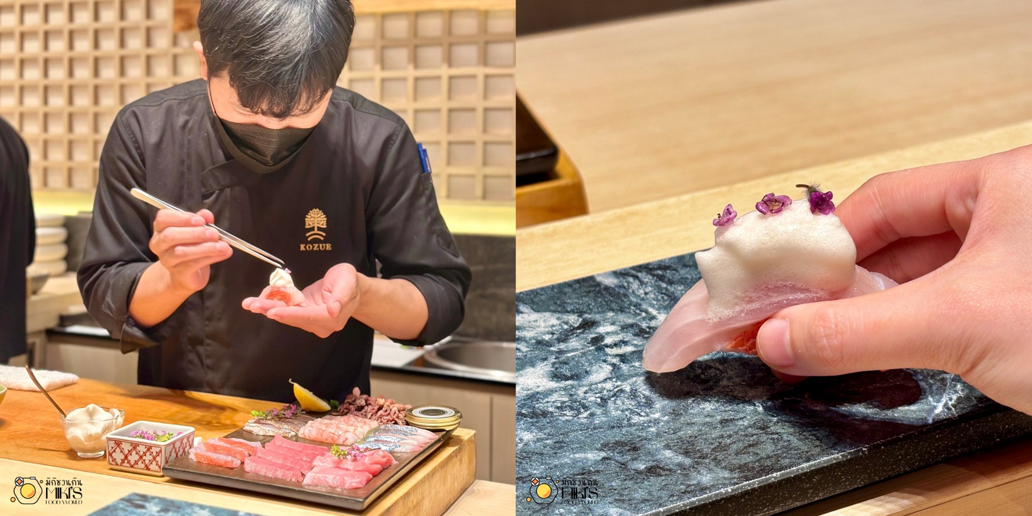 Kinmedai กระพงตาสีทองที่มีเนื้อสัมผัสนุ่มเด้ง มีรสหวานของเนื้อปลา ท็อปด้วยโชยุสาเกที่นำไปทำเป็นโฟมนุ่มฟู และเสริมความสดชื่นด้วยดอกโอบะหอมๆ