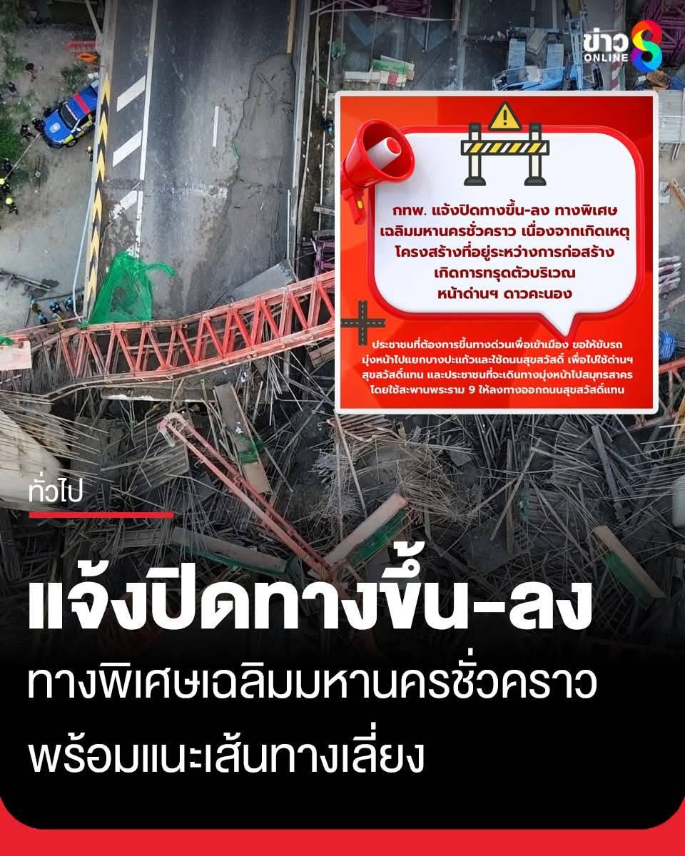 การทางพิเศษแห่งประเทศไทย (กทพ.) แจ้งปิดทางขึ้น-ลง ทางพิเศษเฉลิมมหานครชั่วคราว เนื่องจากเกิดเหตุโครงสร้างที่อยู่ระหว่างการก่อสร้างเกิดการทรุดตัว บริเวณหน้าด่านฯ ดาวคะนอง พื้นที่การก่อสร้างโครงการทางพิเศษสายพระราม 3 - ดาวคะนอง - วงแหวนรอบนอกกรุงเทพมหานครด้านตะวันตก สัญญาที่ 3