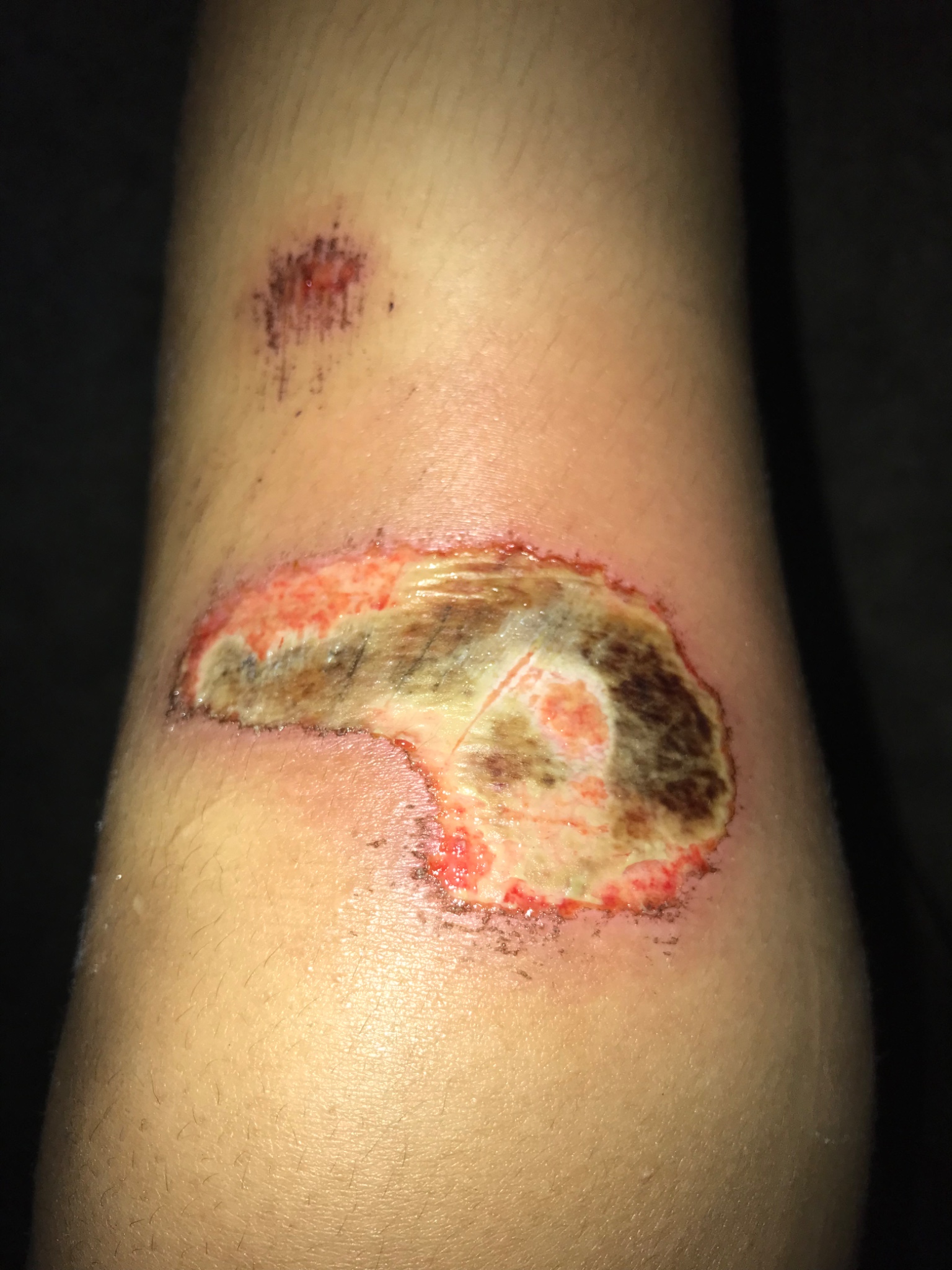 คือเรารถล้มได้5วันแล้วค่ะ ในภาพคือวันที่5 ตอนเป็นแผลสองวันแรก เราล้างที่อนามัยและปิดแผล วันที่สามเราเปิดแผลและล้างเองด้วยน้ำเกลือกับเบตาดีน แผลตึงมาก งอและยืดเข่าไม่ได้ วันที่4 เราล้างน้ำเกลือ แล้ว