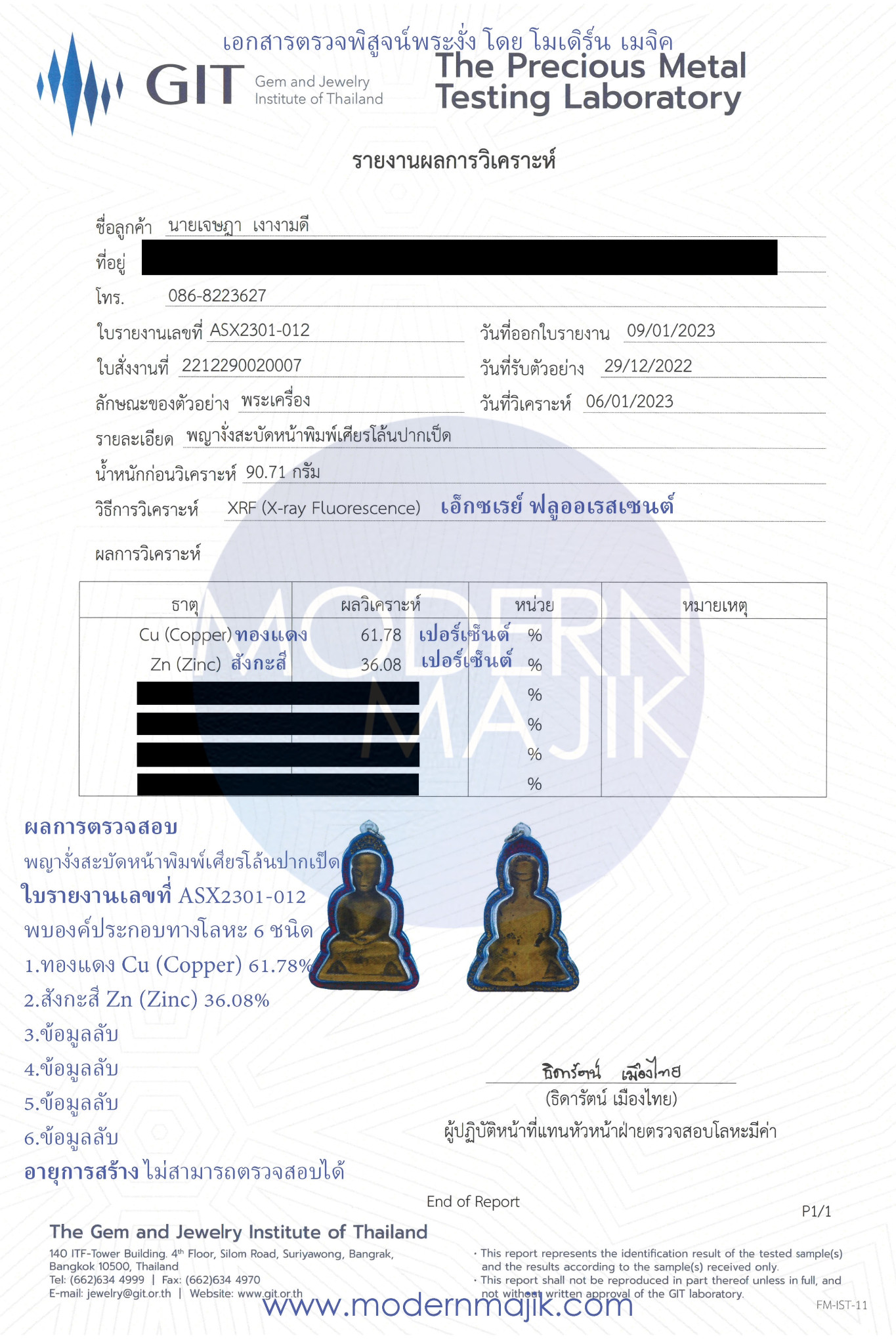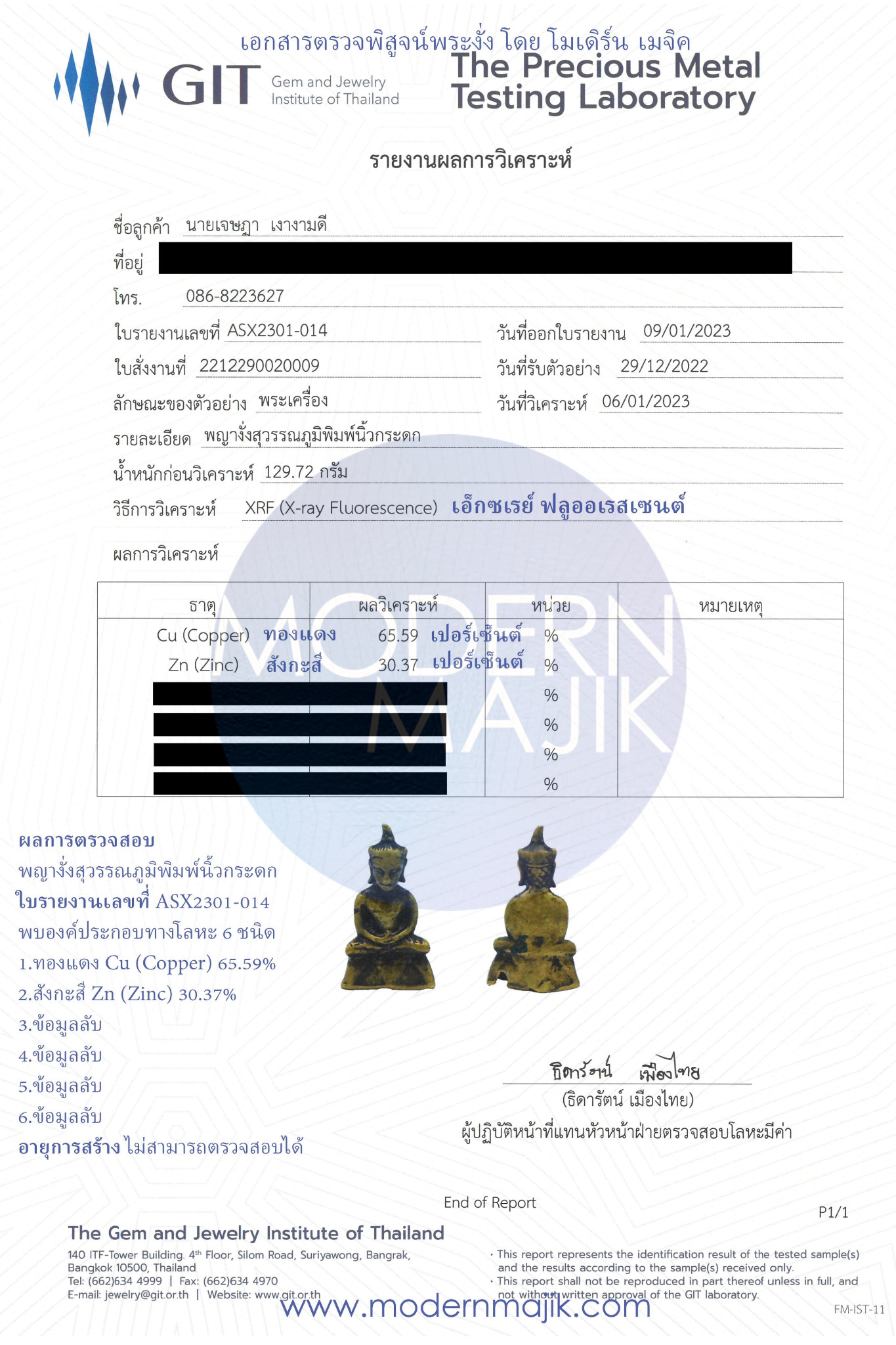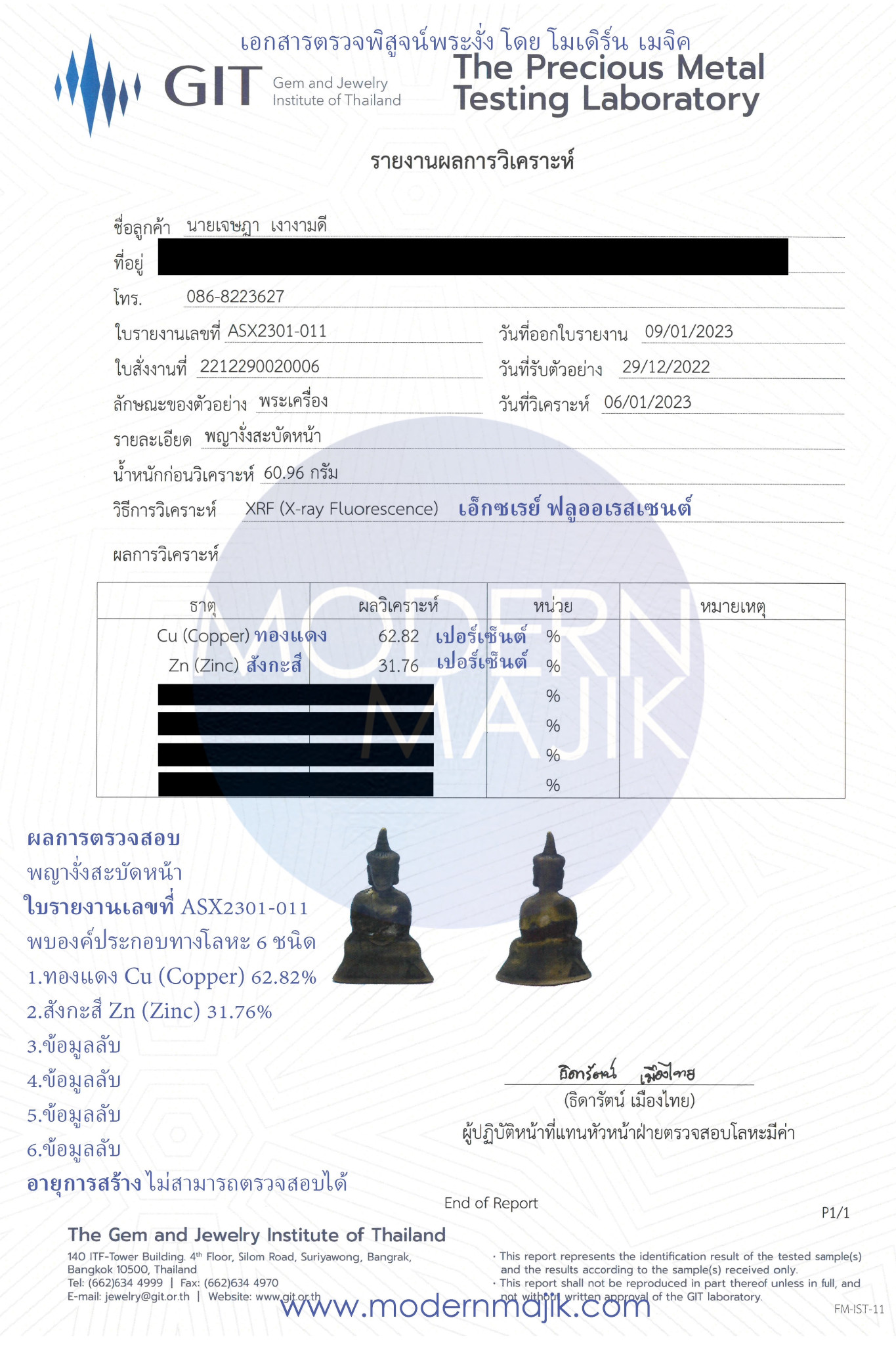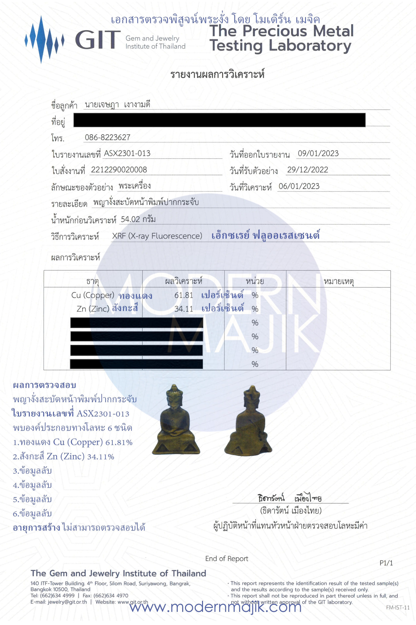 สรุปข้อมูลการตรวจสอบพระงั่งทางโลหะวิทยา ด้วยเทคนิค X-Ray Fluorescence (เอ็กซเรย์ ฟลูออเรสเซนต์)