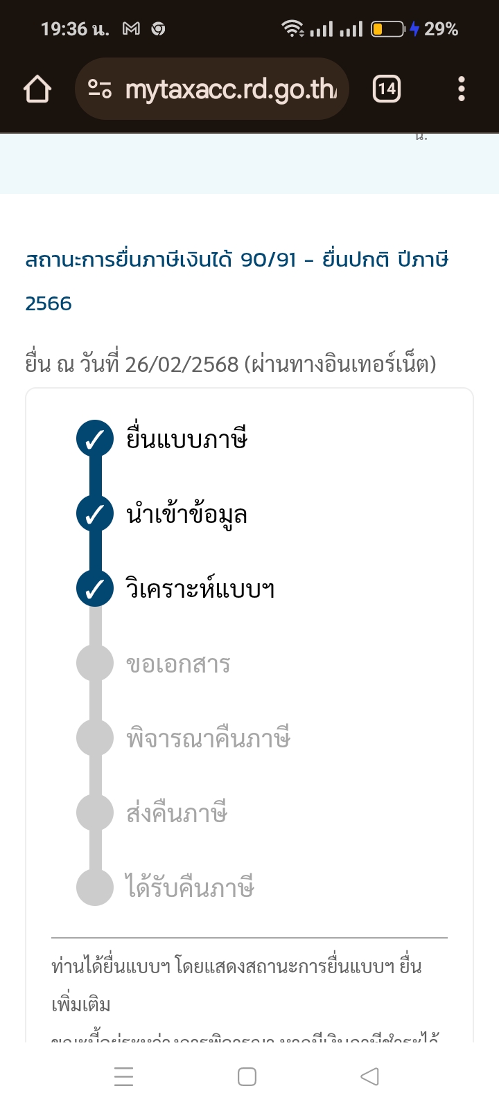 เรายื่นภาษีเข้าระบบตั้งแต่วันที่ 18-01-24 สถานะไม่มีความเคลื่อนไหวอยู่ที่วิเคราะห์แบบ จนถึงวันที่ 21-02-24 เราเลยแนบเอกสารที่มีทั้งหมดเข้าระบบไปโดยที่ไม่มีการร้องขอ เราตรวจสอบสถานะทุกวันจนว