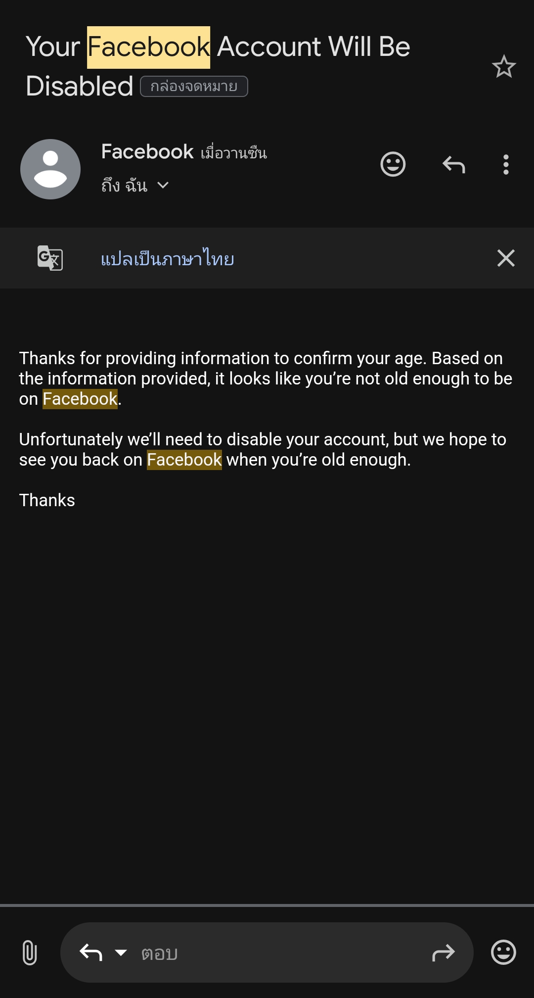 ได้รับข้อความรหัสยืนยันจาก Facebook ค่ะ