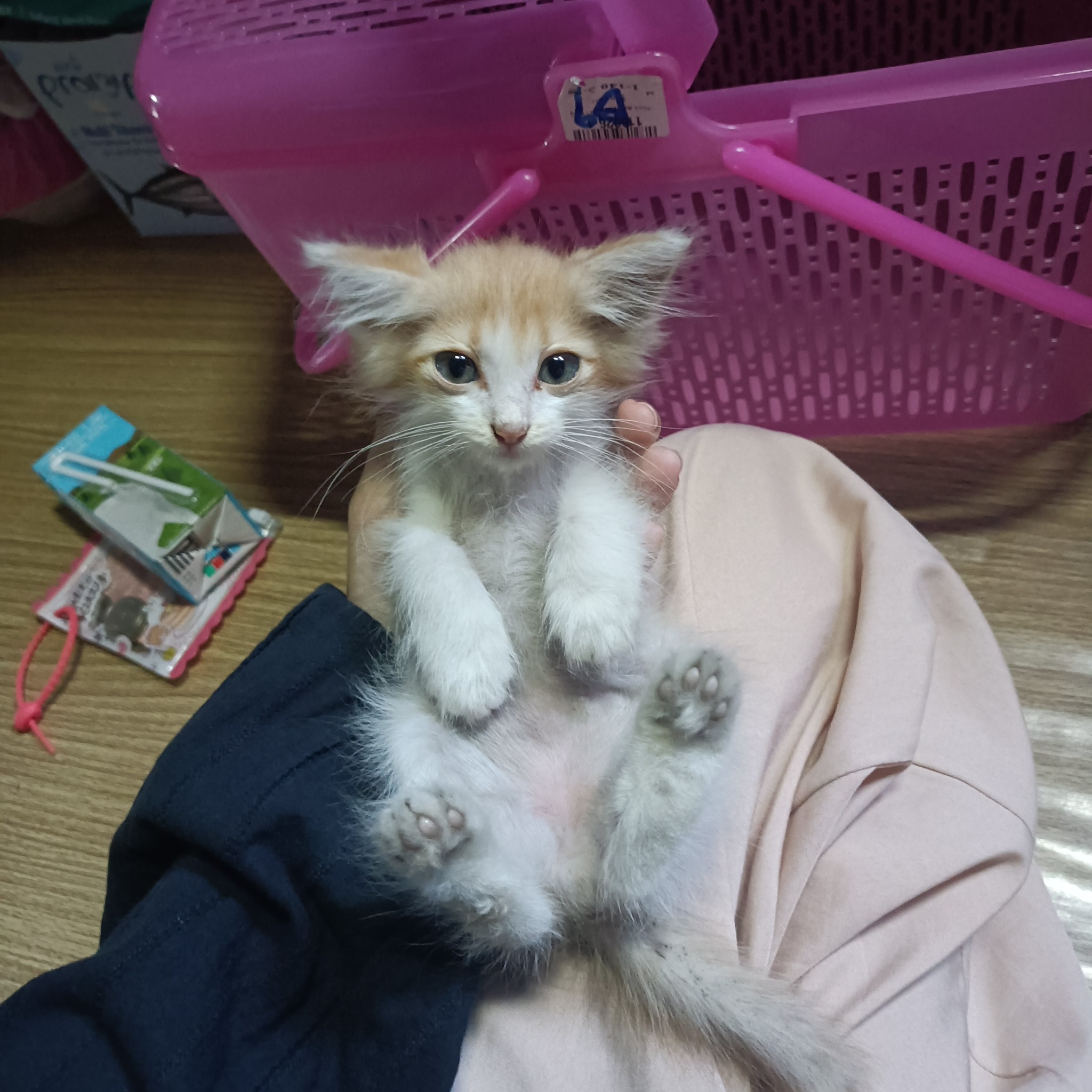 ลูกแมวตัวนี้เกิดบนฝ้าเพดาน บนห้องประชุม ในโรงงานค่ะ ได้ยินเสียงครั้งแรก ตอนที่ทุกคนกำลังประชุมกันอยู่ หลังจากนั้น ไม่กี่วัน ลูกแมวก็ร้องเสียงดัง จึงต้องนำตัวลงมา พี่น้องตัวอื่น มีพนักงานรับไปดูแลแล้ว