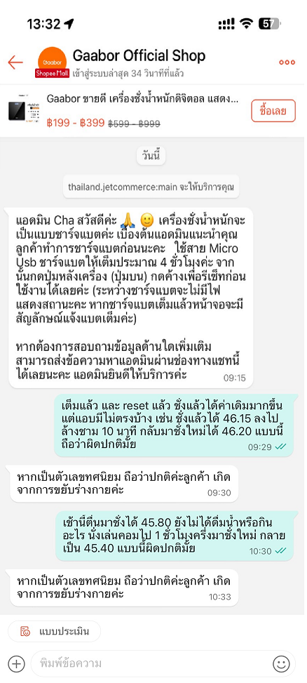 ลองทำตามที่คนขายแนะนำแล้วด้วยการชาร์จไฟเต็มแล้วกด reset ก็ชั่งในเวลาไล่เลี่ยกันได้ค่าเดิมมากขึ้นครับ แต่เวลาห่างกันแค่ 10 นาที ค่าเริ่มมีต่างกัน เวลาห่างที่ 1 ชั่วโมงครึ่ง ค่าก็เริ่มมีต่างกันอีก โดยที่ไม่ได้กินข้าวกินน้ำอะไร แบบนี้ผิดปกติจนต้องขอเงินคืนมั้ย แต่คนขายบอกว่าไม่ผิดปกติเพราะแค่คลาดเคลื่อนหลักทศนิยม