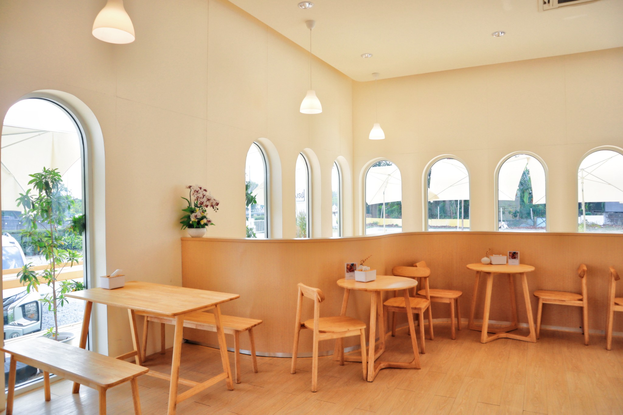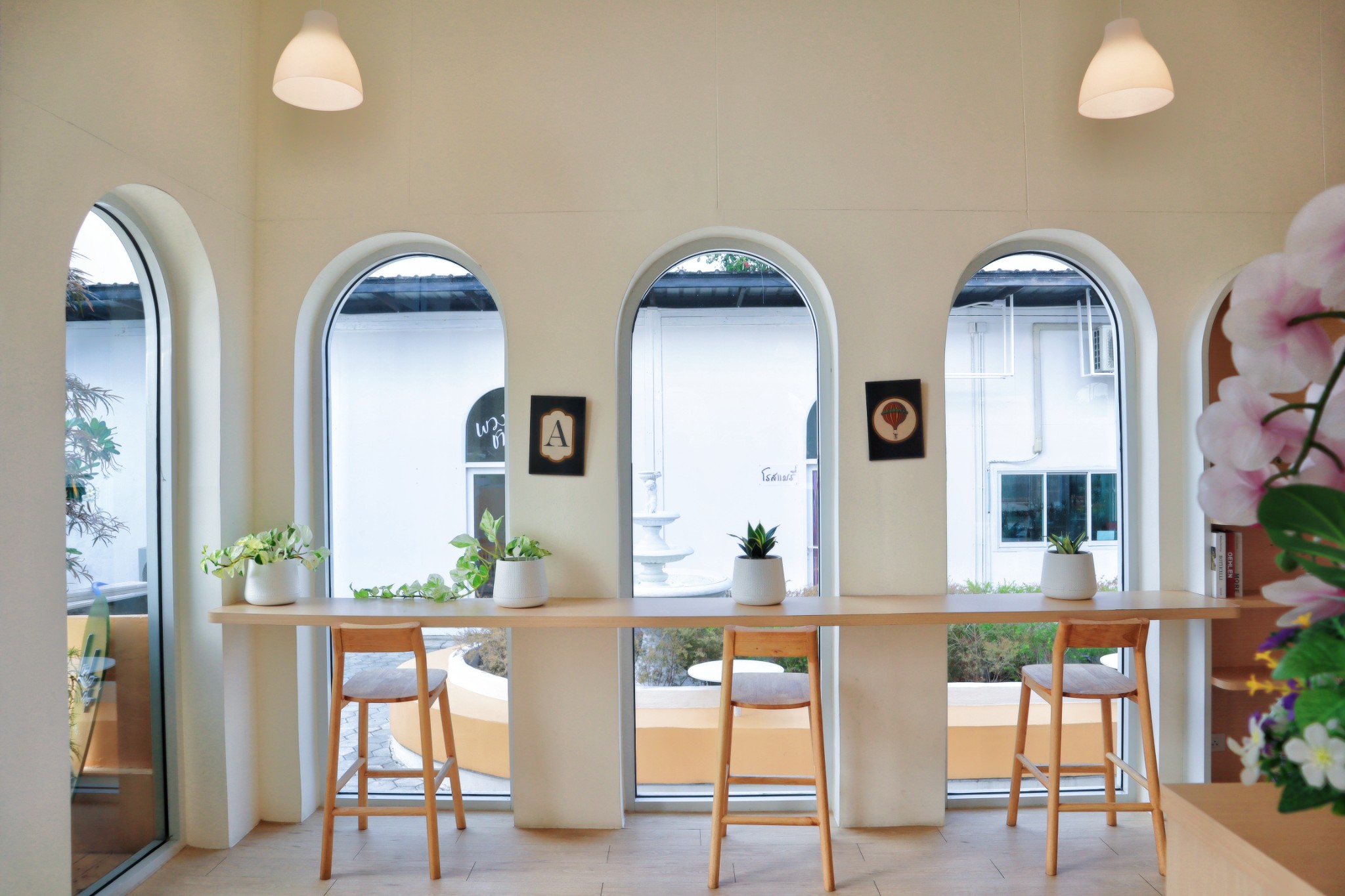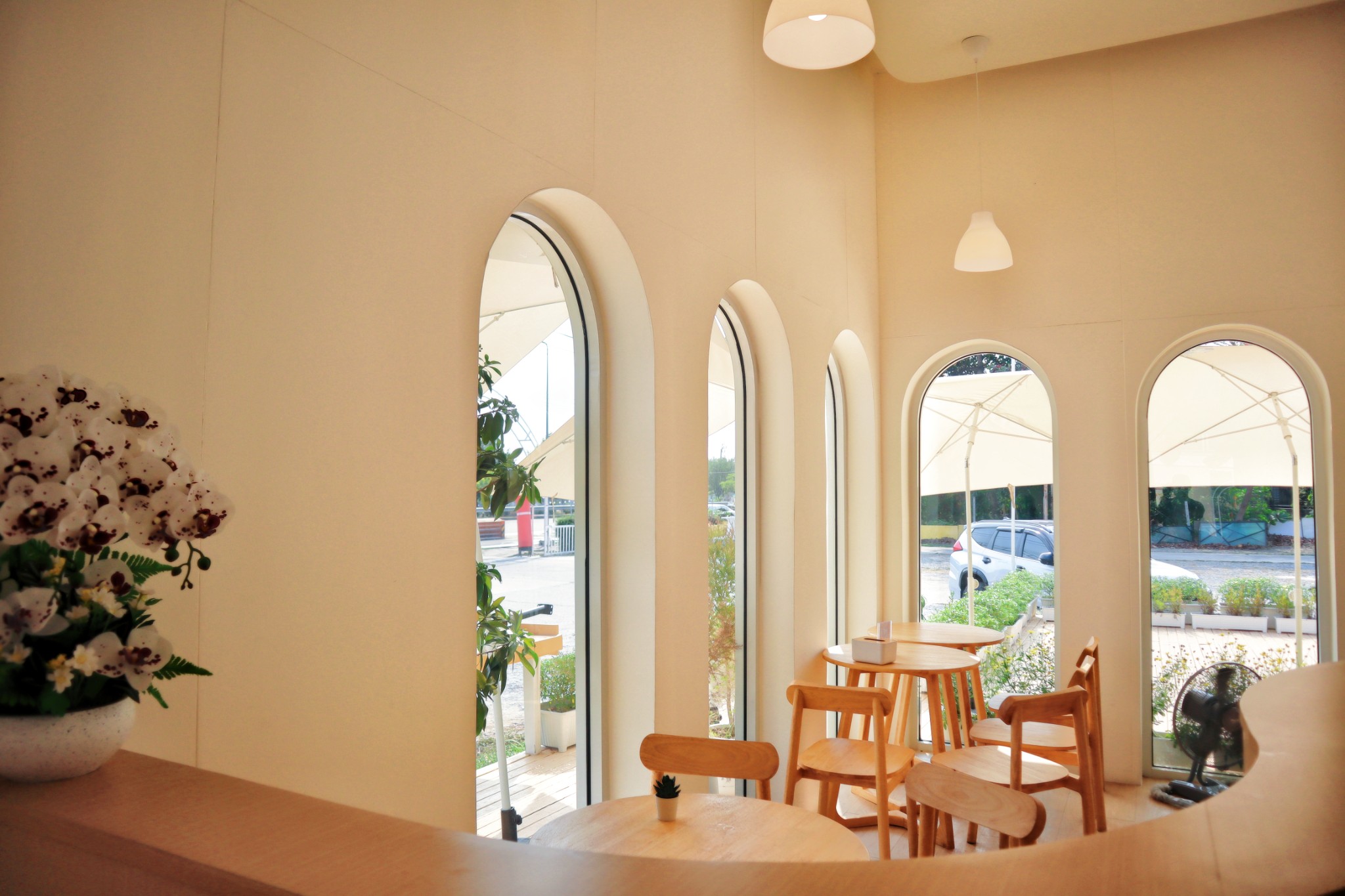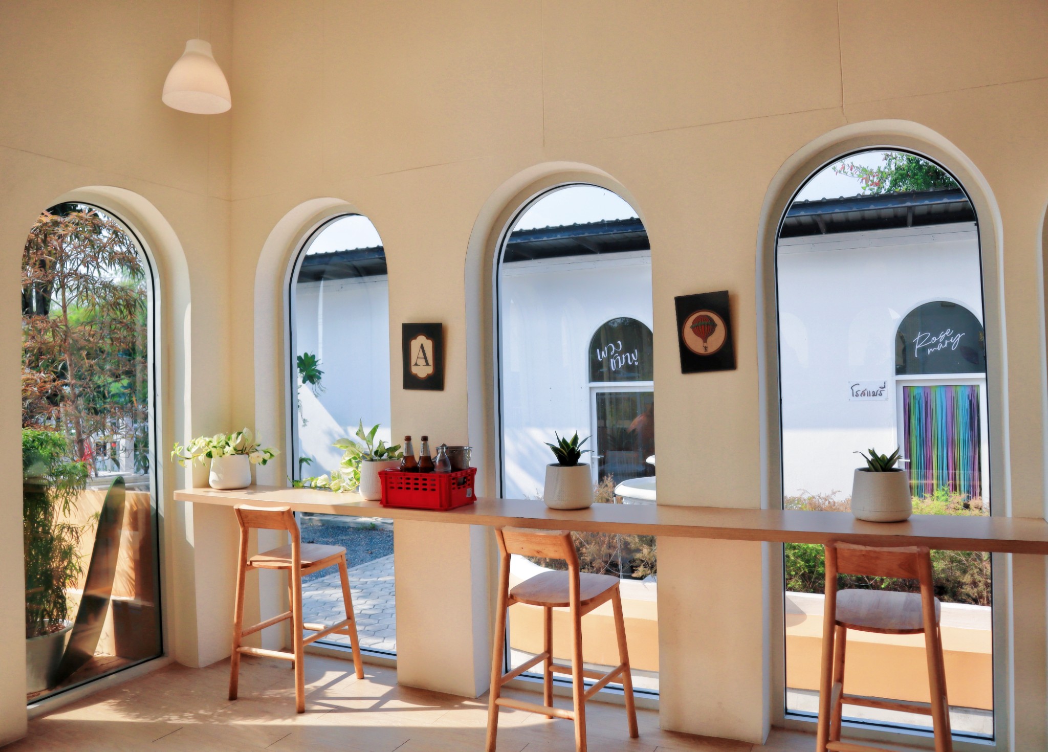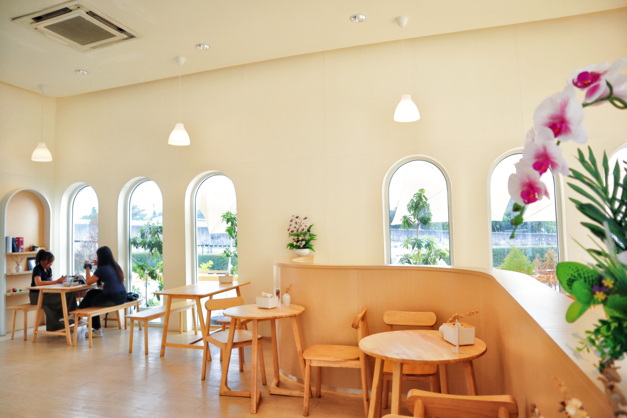 ส่วนร้านกาแฟสีขาวครีมมินิมอล ด้านในดูอบอุ่นนั่งสบายจัดตกแต่งด้วยโต๊ะเก้าอี้สีไม้อ่อน
