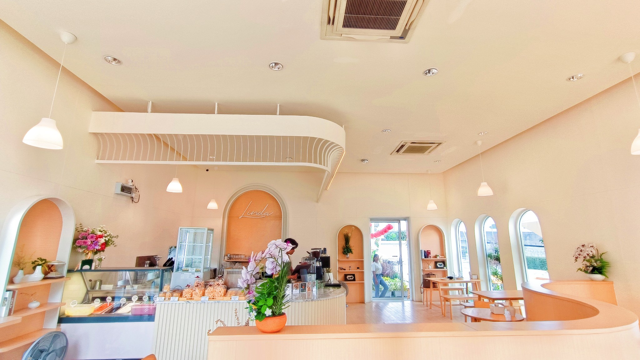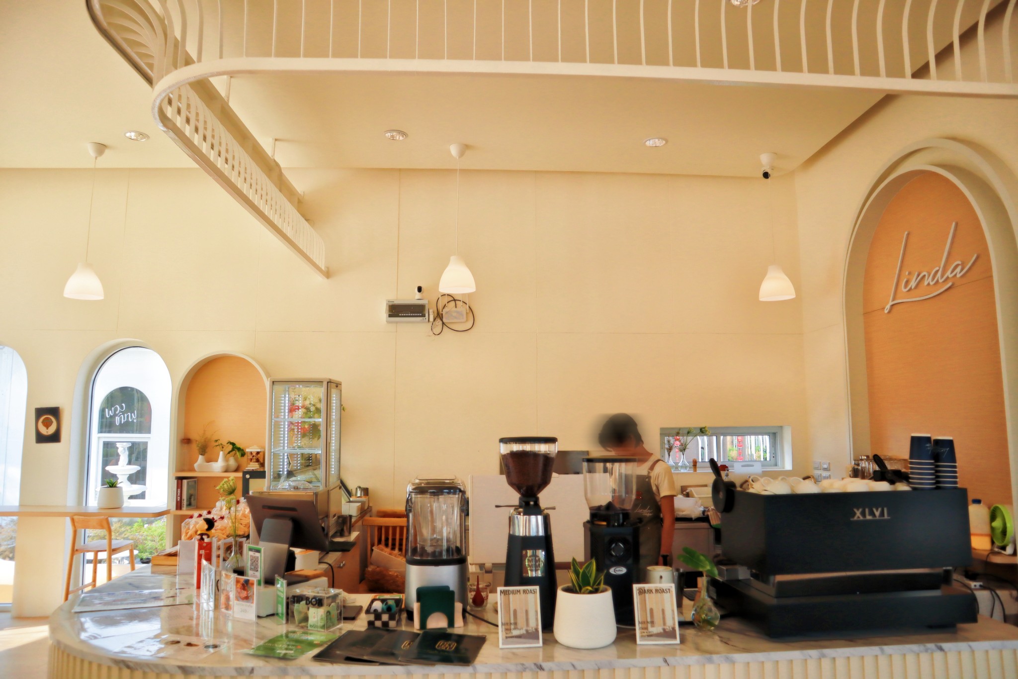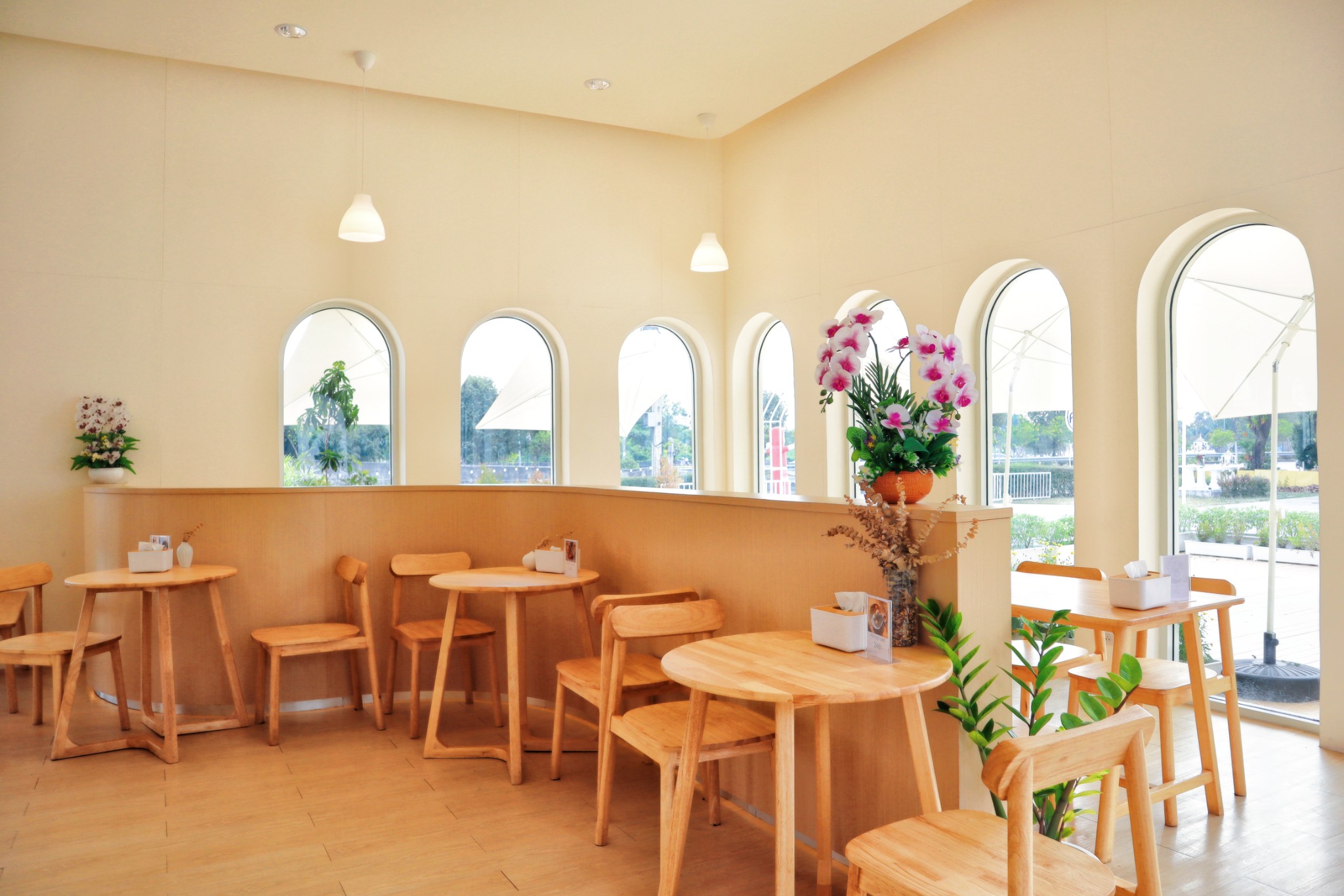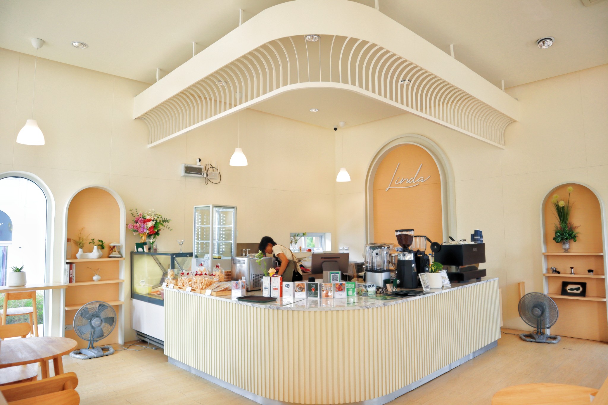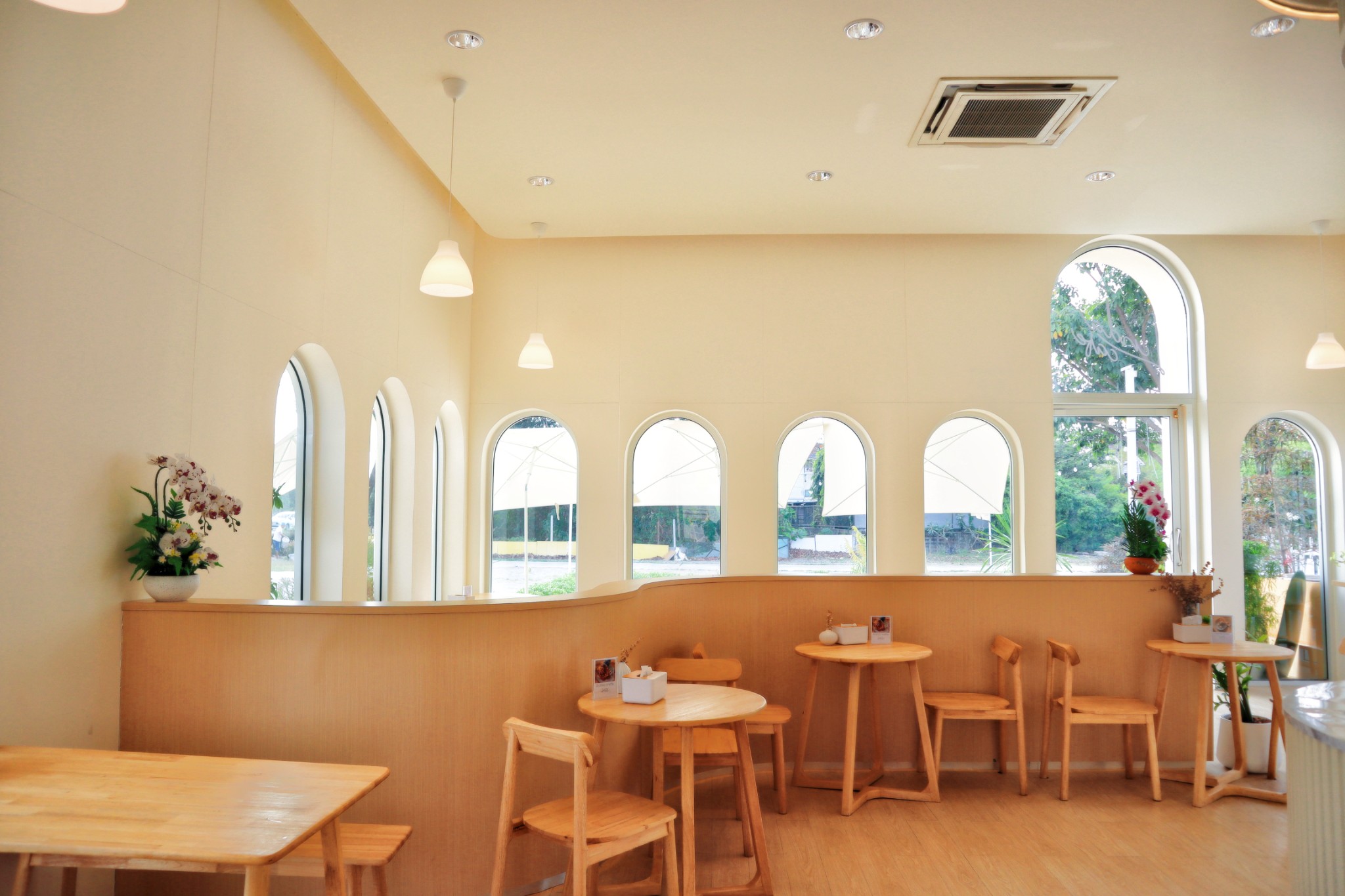 ส่วนร้านกาแฟสีขาวครีมมินิมอล ด้านในดูอบอุ่นนั่งสบายจัดตกแต่งด้วยโต๊ะเก้าอี้สีไม้อ่อน