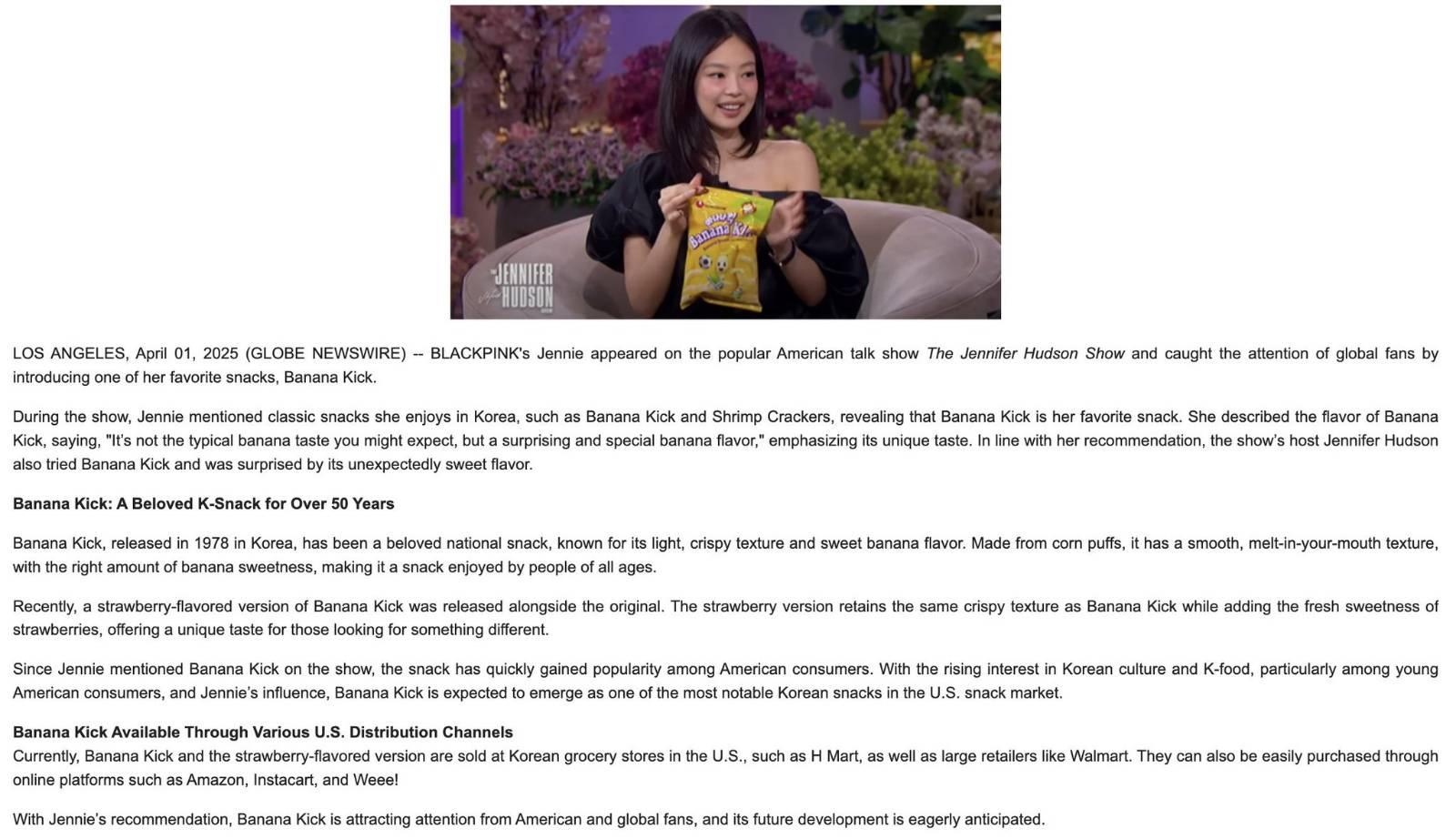 ด้วยอิทธิพลของ JENNIE คาดว่า Banana Kick จะกลายมาเป็นหนึ่งในขนมขบเคี้ยวเกาหลีที่โดดเด่นที่สุดในตลาดสหรัฐอเมริกา