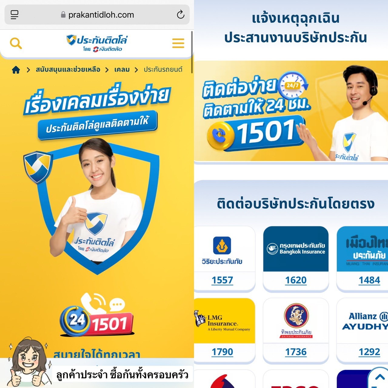 - ติดต่อง่าย จะแชทผ่าน messenger , line หรือโทร 1501 ก็ได้ เจ้าหน้าที่ประสานงานให้ตลอด 24 ชม. มีบริการช่วยเหลือฉุกเฉินให้ครบทุกบริษัท ครอบคลุม 1,700 สาขาทั่วประเทศไทย ไปไหนก็เจอ.. ใครไม่สะดวกติดต่อช่องทางออนไลน์ก็สามารถวอร์คอินเข้าไปได้ทุกสาขาค่ะ