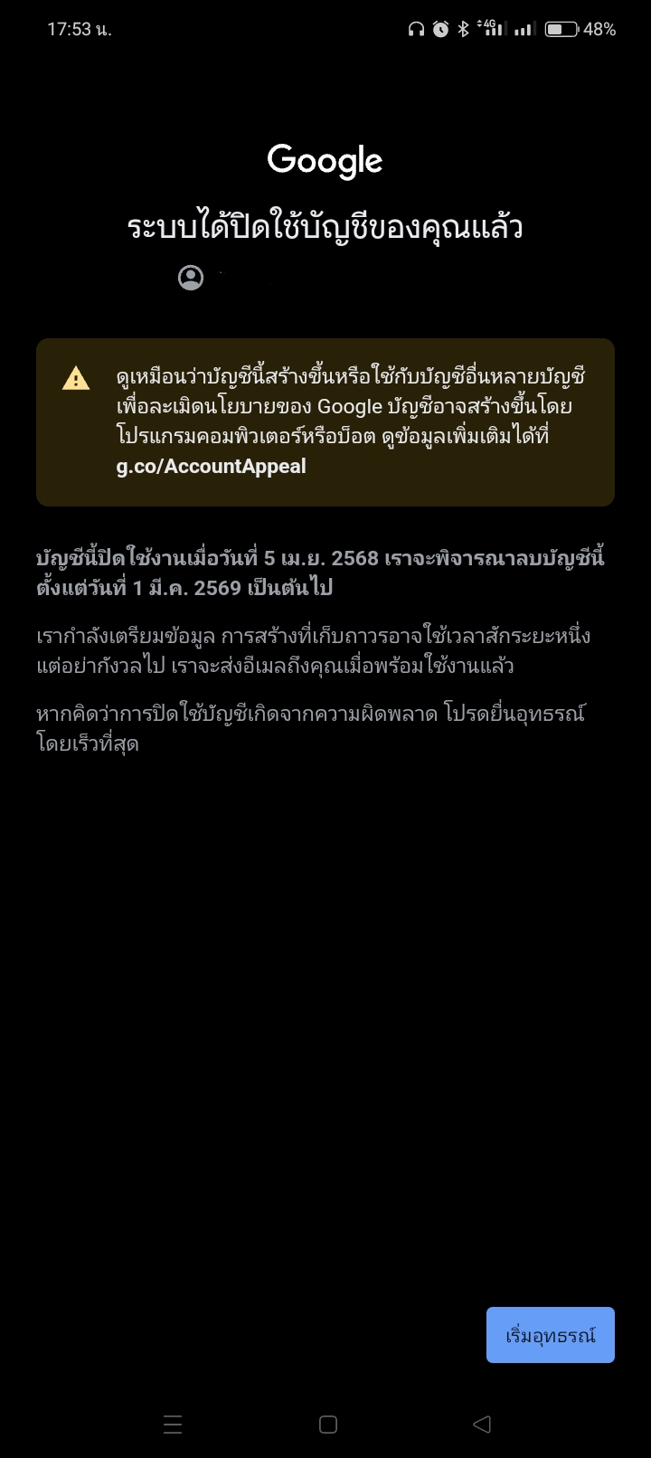 ก็ตามหัวข้อนั่นแหละค่ะ โดนปิดแบบงง ๆ จริง ๆ เพราะอีเมลล์ที่ใช้งานและโดนปิดตัวนี้ใช้แค่สองอย่างคือ 1 ยูทูปพรีเมี่ยมรายปี และ 2 ใช้ผูกกับเฟสบุ๊คที่เราแทบไม่ได้เข้าไปแตะอะไรเลยนอกจากผูกสองอย่างนี้ไว้ และเมื่อวานก็มีการเตือนแปลก ๆ เด้งขึ้นมาว่าต้องยืนยันบัญชีทั้งที่ยืนยันไปแล้ว และวันนี้ช่วงเย็น ก็เป็น ตามภาพนี้เลยค่ะ 🥹 ไม่เข้าใจว่าพักหลังมันเกิดอะไรขึ้น มีบ่อยครั้งมากที่ปิดอีเมลล์ที่เราสมัครไว้ผูกแอปอื่นแบบแยก ๆ กันกระจ่ายความเสี่ยง โดนปิดจนเหลือแค่สองบัญชีสุดท้ายแล้วค่ะ ไม่เข้าใจจริง ๆ ว่าไปละเมิดเขาตอนไหนในเมื่อแทบไม่ได้แตะต้องอะไรเลย 🥹
