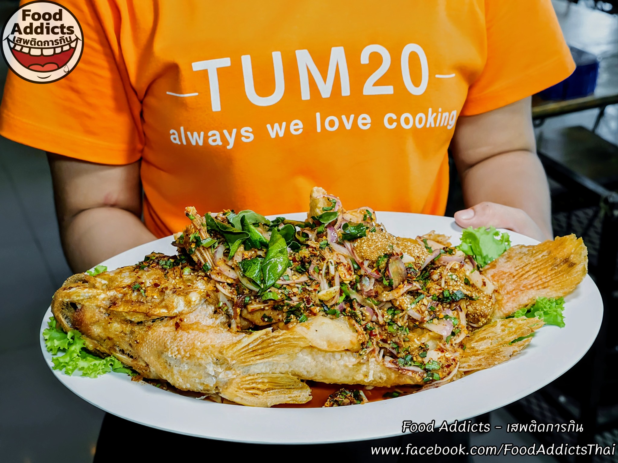 ไม่ได้คาดหวังแต่สิ่งนี้มันยิ่งใหญ่เกินคาดเมื่อน้องพนักงานยกออกมาเสิร์ฟจากห้องครัวลูกค้าทุกคนต่างจ้องมองมาทางเดียวกันนั่นก็คือ "น้ำตกปลาทับทิม" ราคา 259 บาท เลือกใช้เฉพาะปลาไซส์จัมโบ้คัดพิเศษส่งตรงจากฟาร์มเลี้ยงควบคุมตามมาตรฐานแบรนด์ CP ขอดเกล็ดควักลำไส้ล้างทำความสะอาดแล่เฉพาะเนื้อล้วนแบบฟินเลย์หั่นชิ้นขนาดพอดีคำตักรับประทานสะดวก คลุกเคล้าแป้งสาลีอเนกประสงค์ลงทอดน้ำมันยกทั้งตัวผิวด้านนอกกรอบสีทองสวยงามจัดเรียงลงภาชนะจานเปลราดเครื่องน้ำตกสมุนไพรใส่พริกป่น,ข้าวคั่ว,หอมหัวแดง,ผักชีฝรั่งใบเลื่อยปรุงรสด้วยน้ำปลา,มะนาวคั้นสด,น้ำตาลทรายเปรี้ยวอมหวานเค็มกลมกล่อมโรยใบมะกรูดทอดปิดท้ายแซ่บจี๊ดจ๊าดปริมาณเยอะเกินคุ้มแนะนำว่าห้ามพลาดเด็ดขาด / "ไข่ตุ๋นทะเลภูเขาไฟลาวา" ราคา 199 บาท ตอกไข่ไก่ตีผสมเข้ากับน้ำซุปเข้มข้นสูตรลับคิดค้นเองของทางร้าน "ตำ20" ตามอัตราส่วนที่กำหนดค่อยเทลงหม้อไฟวัสดุสแตนเลสช่วยนำความร้อนรวดเร็วทันใจบรรจุก้อนถ่านไม้เผาตรงกลางปิดฝารอสุกประมาณ 70% จากนั้นค่อยตกแต่งท็อปปิ้งกุ้งขาวทะเลแกะเปลือก,ปลาหมึกโรยต้นหอม,กระเทียมเจียวอีกสักครู่จะเริ่มพองฟูส่งกลิ่นหอมยั่วน้ำลาย เนื้อสัมผัสแน่นประดุจขนมคัสตาร์ดละมุนไหลลื่นลงคอเหมาะสำหรับกินเพื่อบรรเทาอาการเผ็ดหน้าตาอลังการชวนถ่ายรูปอวดเพื่อนๆครับ