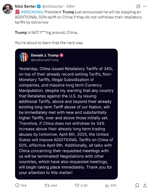 แถลงการณ์มีใจความว่า “เมื่อวานนี้ จีนออกมาตรการภาษีตอบโต้ 34%” และกล่าวอีกว่า “ผมได้เตือนไปแล้วว่าชาติใดก็ตามที่ตอบโต้สหรัฐฯด้วยการสั่งเพิ่มภาษีจากของเดิมที่มีมาก่อนที่เป็นการทำร้ายประเทศอเมริกาของพวกเรา จะต้องพบกับมาตรการใหม่ทันทีเป็นอัตราภาษีที่สูงกว่าเดิม”