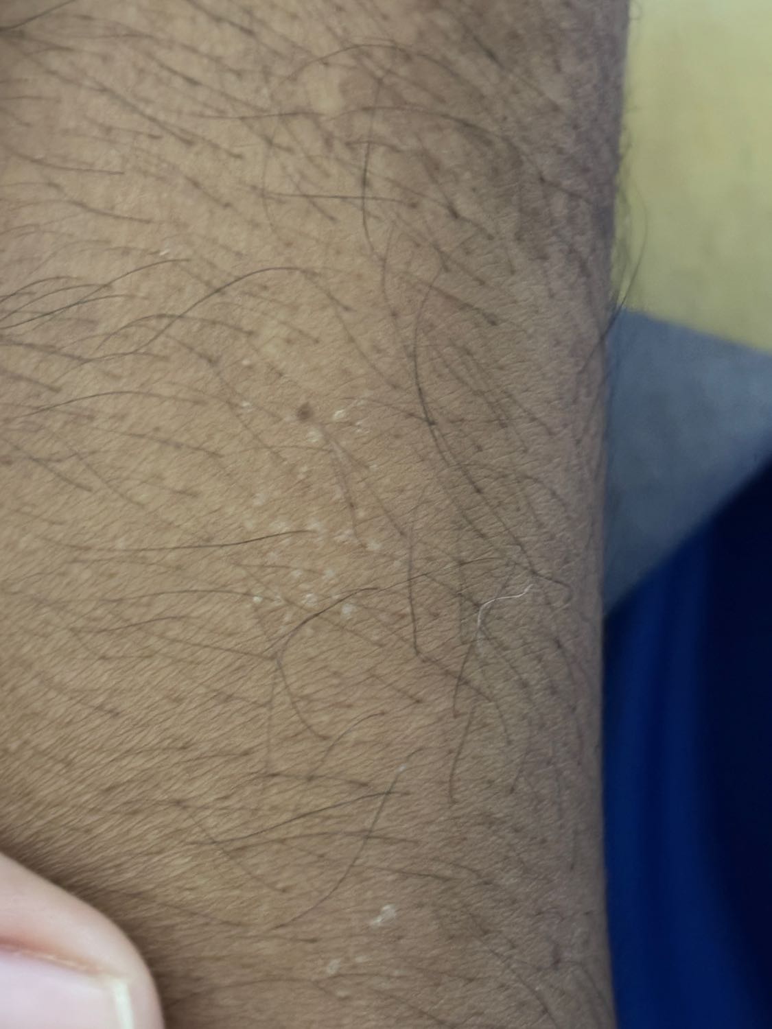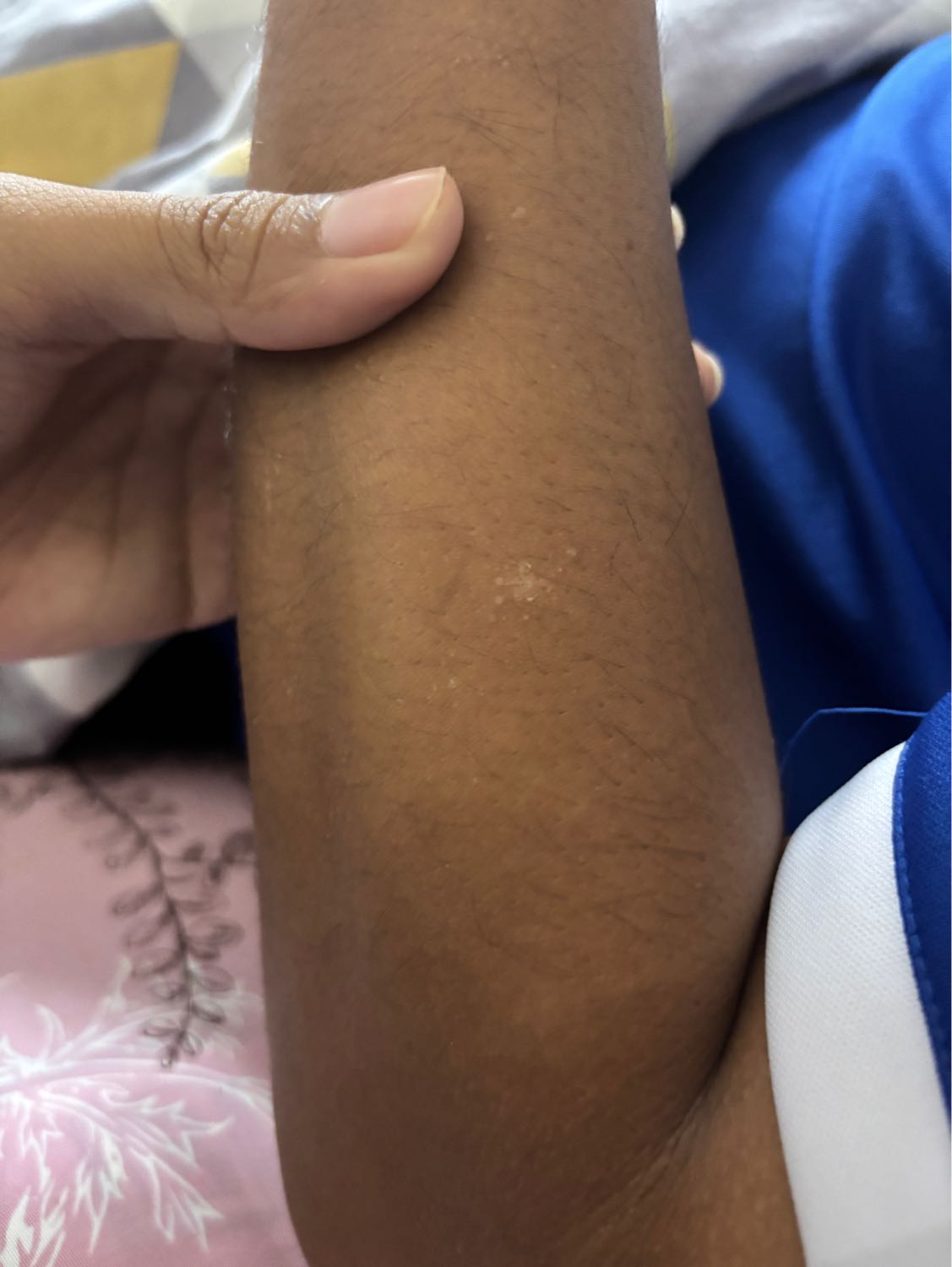 แขนมีรอยขาวๆจุดเล็กๆ ขึ้นบริเวณรูขุมขน ไม่มีตุ่มนูน มันเรียบไปกับผิว เพียงแค่เป็นจุดขาวๆ