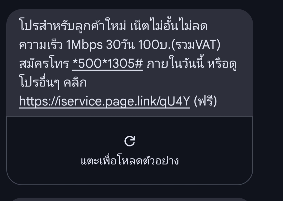 "โปรสำหรับลูกค้าใหม่ เน็ตไม่อั้นไม่ลดความเร็ว 1Mbps 30วัน 100บ.(รวมVAT) สมัครโทร *500*1305# ภายในวันนี้"