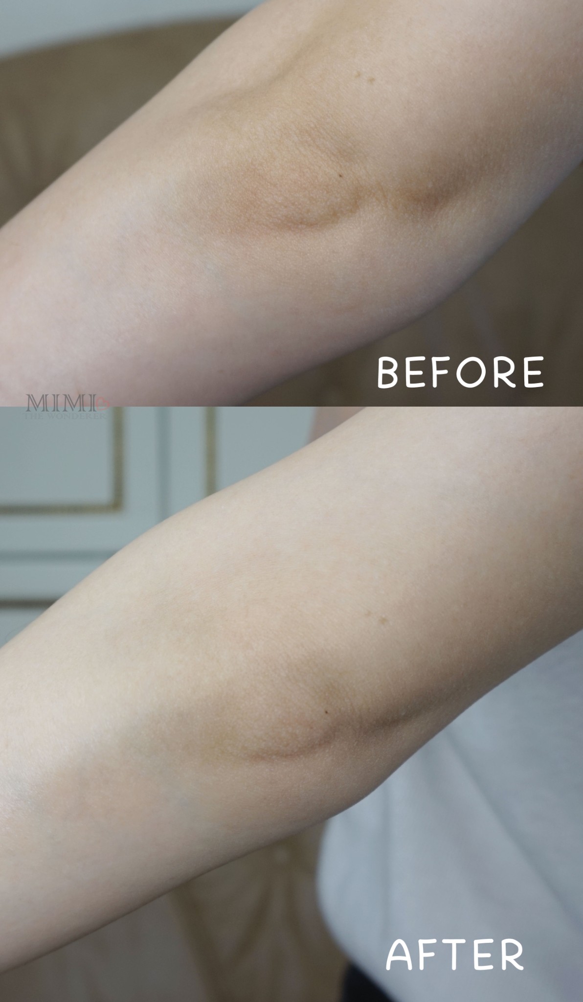 หลังใช้ทันที เรารู้สึกว่าเวลาโลชั่นซึมเข้าสู่ผิวแล้ว ผิวดูกระจ่างใสขึ้นเลย เมื่อใช้ไปประมาณ 2 สัปดาห์ เรารู้สึกได้เลยว่าผิวชุ่มชื้นขึ้น สีผิวดูสม่ำเสมอขึ้น โดยรวมสีผิวที่แขน และหลังข้อศอกดูสว่าง กระจ่างใสขึ้น