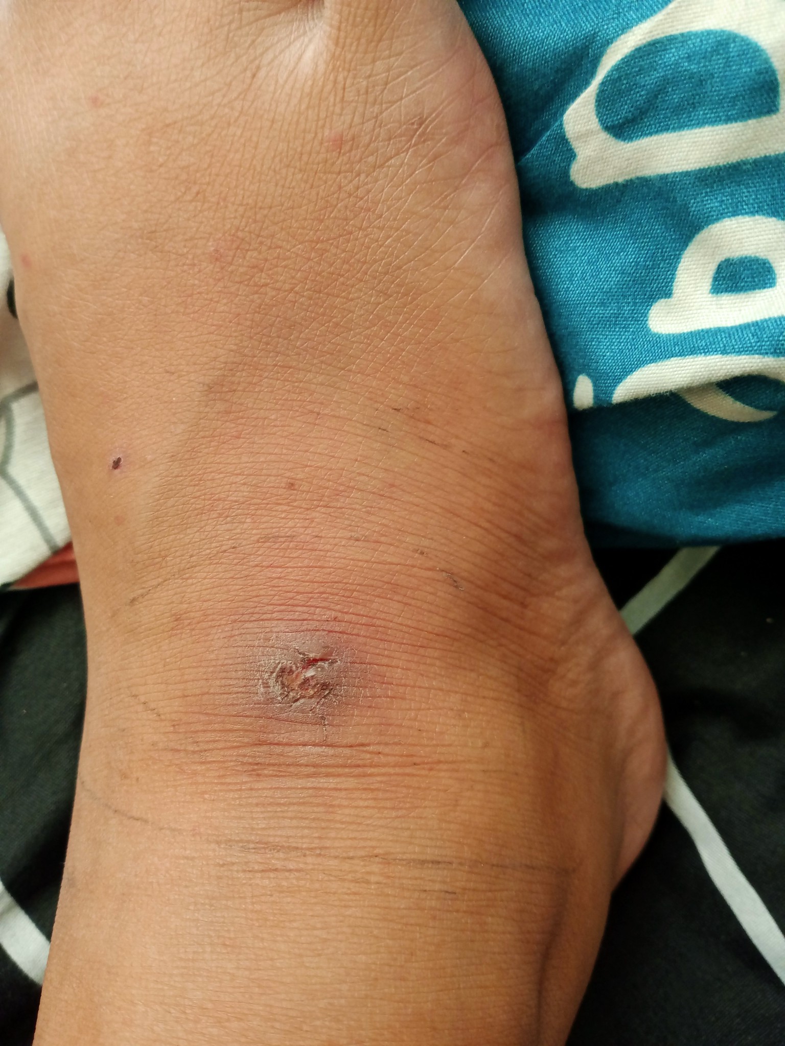 พอดี เมื่อวันที่ 6 ไปเล่นน้ำมาค่ะเป็นเขื่อน ตอนเล่นขาน่าจะไปโดนหินค่ะ ตอนนั้นรู้สึกแค่ชา แต่พอขึ้นจากน้ำเป็นแผลเลยค่ะ เหมือนในรูป(แช่น้ำนานมากค่ะกว่าจะขึ้น) พอกลับบ้านเลยล้างแผล ทาเบตาดีนค่ะ แต่วันถัดมาแผลเกิดอาการเจ็บและแดงมากเลยค่ะ